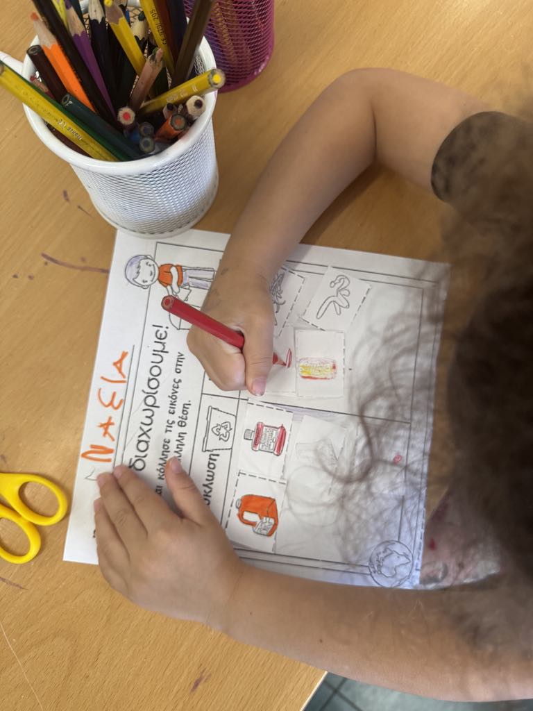 Στα πλαίσια του εργαστηρίου δεξιοτήτων για την ανακύκλωση, τα παιδιά έφτιαξαν μπλε κάδο ανακύκλωσης, μάζεψαν τα σκουπίδια από την θάλασσα και τα τοποθέτησαν στον κάδο που ταίριαζε το καθένα, ανάλογα με το υλικό του.