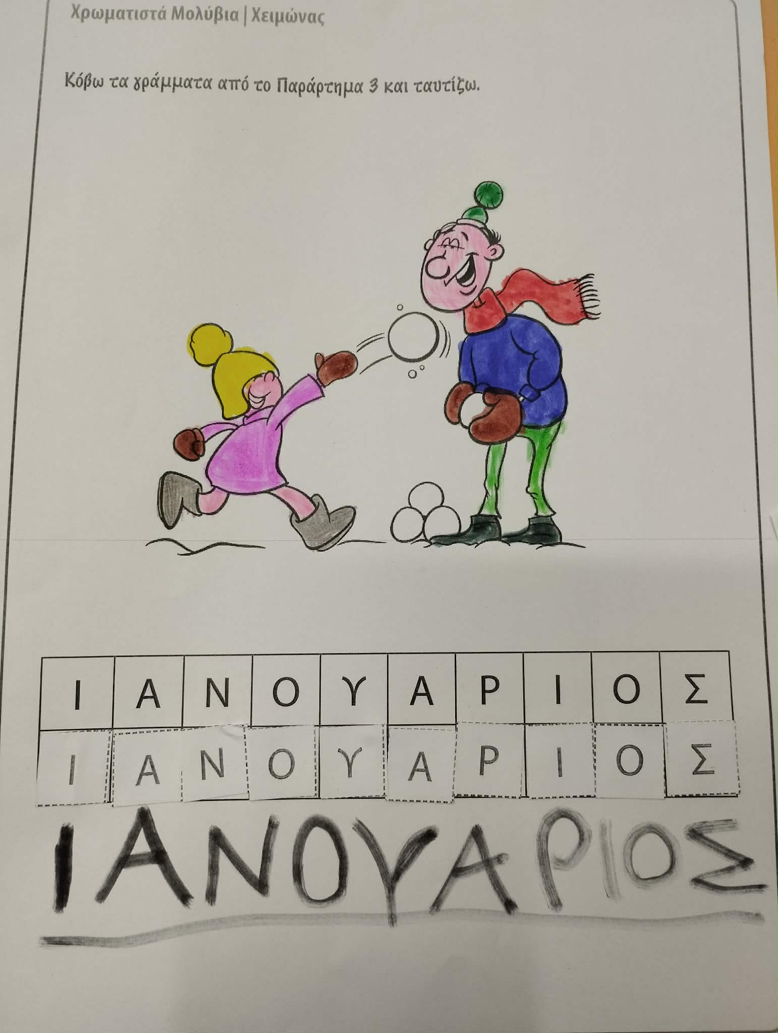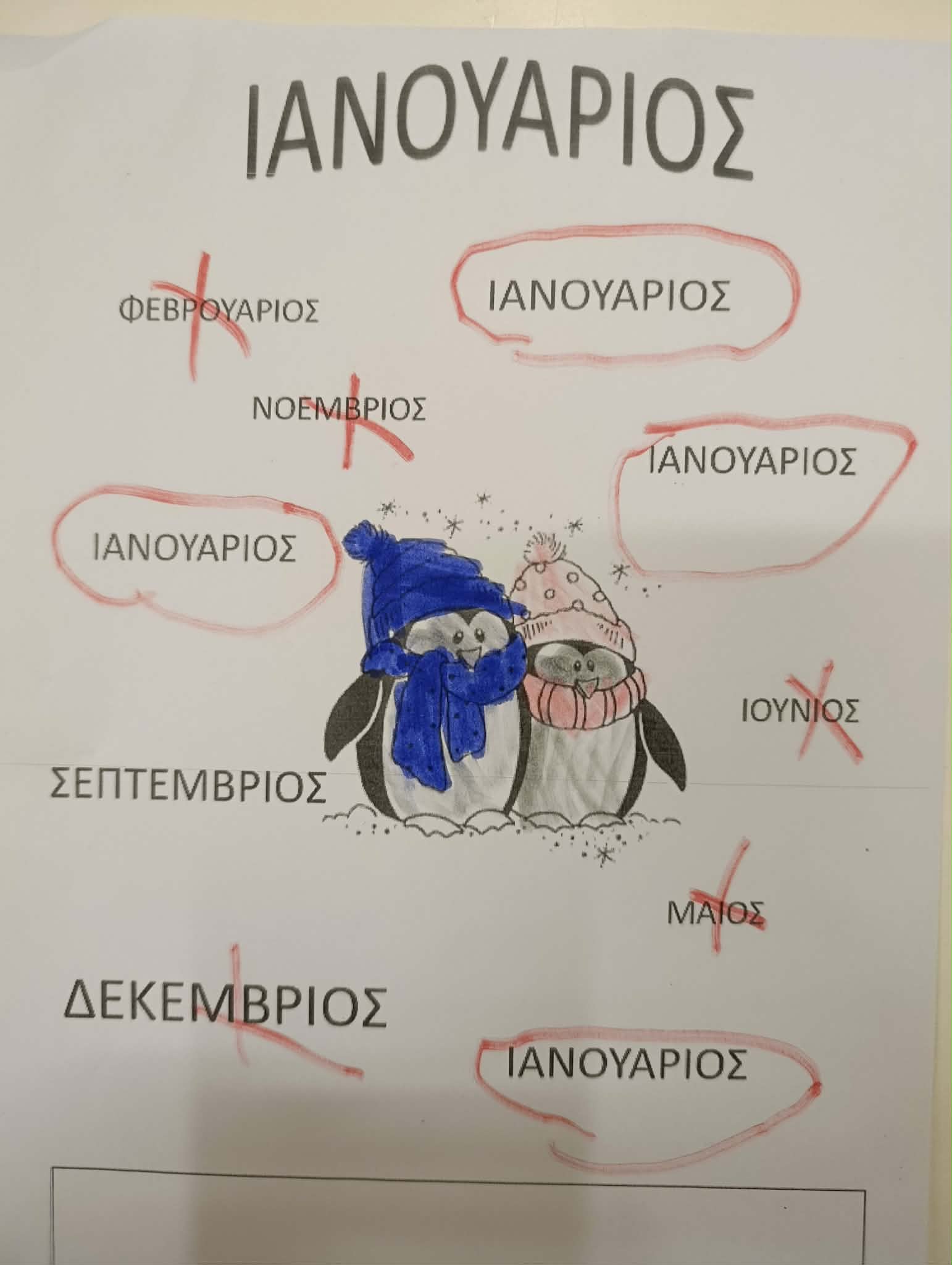 Τέλος, γνωρίσαμε τον πρώτο μήνα του χρόνου, τον Ιανουάριο. Τα παιδιά έμαθαν το όνομά του, το έγραψαν και τον κύκλωσαν σε φύλλα εργασίας, κάνοντας τα πρώτα τους βήματα στην κατανόηση του χρόνου.