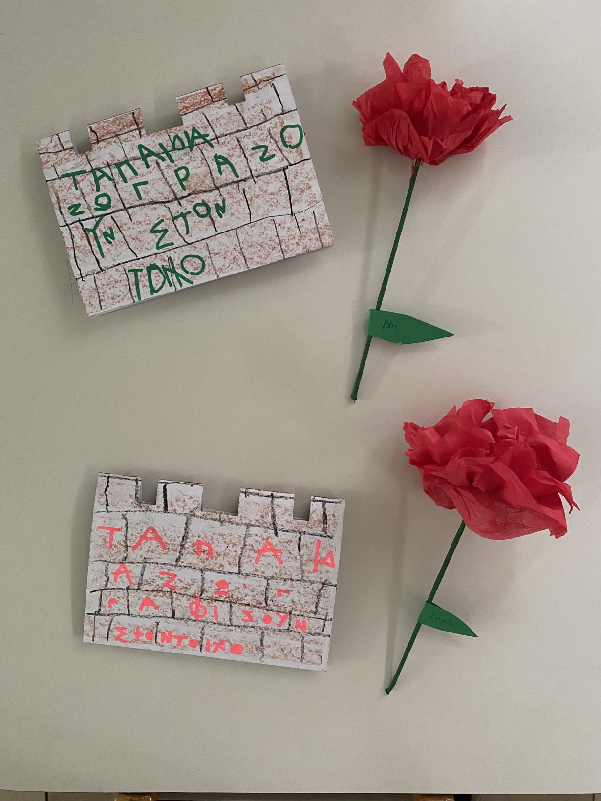 “Χτίσαμε” λοιπόν τους δικούς μας τοίχους, και με σύνθημα “τα παιδιά ζωγραφίζουν στον τοίχο” τους μετατρέψαμε σε μία τρισδιάστατη κάρτα με “δυό καρδιές και έναν ήλιο στη μέση”.