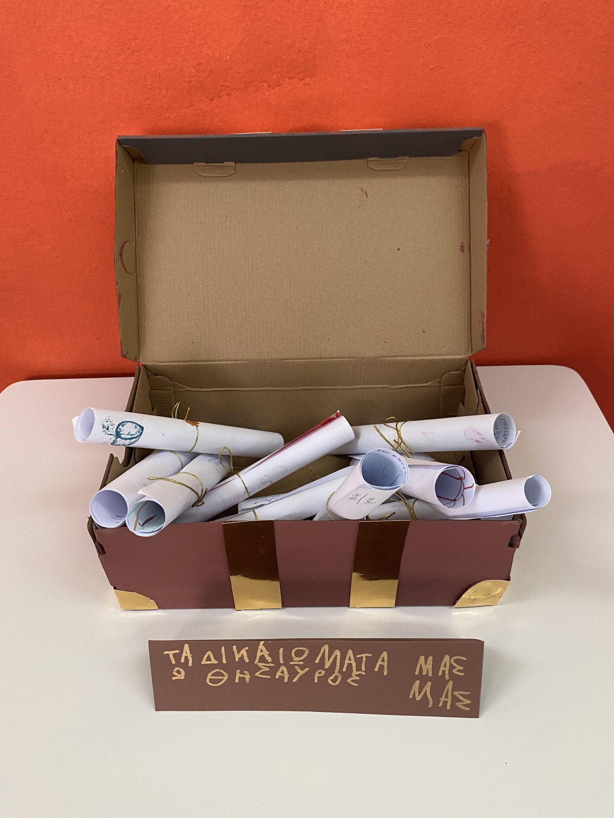 Μελετήσαμε αρκετά από τα άρθρα της Διεθνούς Σύμβασης των Δικαιωμάτων των Παιδιών και με έμπνευση το βιβλίο “Έχω Δικαιώματα; Έχω Δικαιώματα!” του Πάνου Χριστοδούλου, Διευθυντή του Δικτύου των Δικαιωμάτων των Παιδιών, ζωγραφίσαμε τα δικαιώματα μας και τα ασφαλίσαμε σε ένα σεντούκι καθώς αποφασίσαμε πως τα δικαιώματά μας είναι ο θησαυρός μας!7762 0040