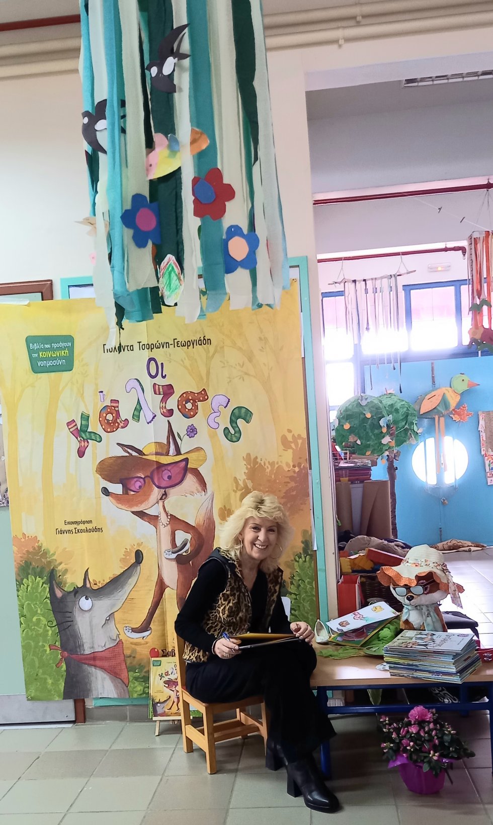 Μετά την ανάγνωση του παραμυθιού “οι κάλτσες”, είχαμε τη χαρά και την τιμή να υποδεχθούμε στο σχολείο μας την συγγραφέα Γιολάντα Τσορώνη – Γεωργιάδη που μας παρουσίασε τους ήρωες της ιστορίας και έπαιξε με τα παιδιά βιωματικά παιχνίδια που ανέδειξαν την αξία της φιλίας και της συνεργασίας. Στο τέλος, ανταλλάξαμε αναμνηστικά δώρα και υπέγραψε τα βιβλία μας.