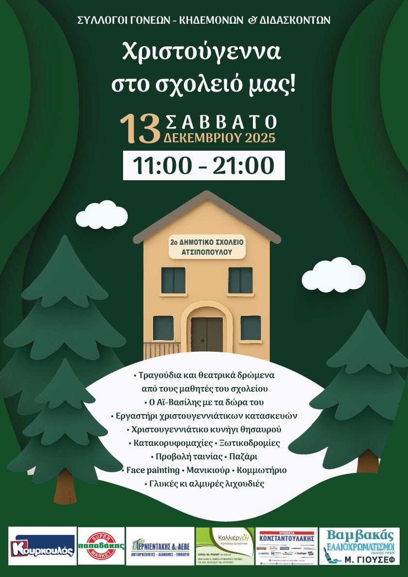 Το Σχολείο δεν θα λειτουργήσει την Δευτέρα 15/12/ 25, λόγω της τοπικής εορτής του πολιούχου του Ατσιπόπουλου, Αγίου Ελευθερίου.