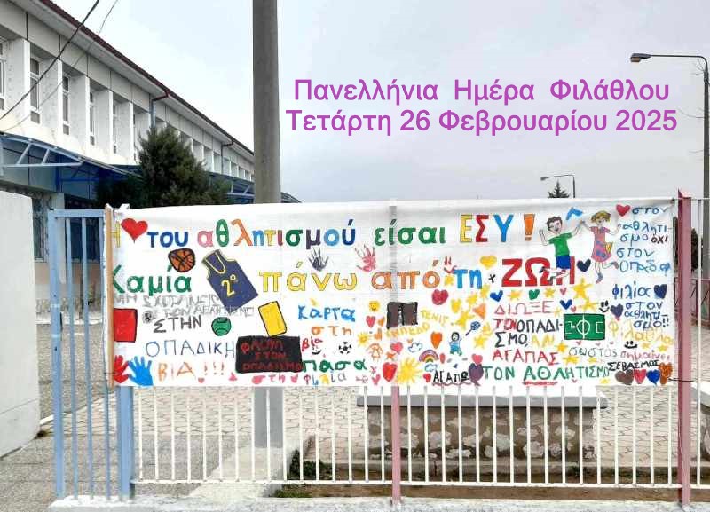 Οι μαθητές, οι μαθήτριες και οι εκπαιδευτικοί του 2ου Δημοτικού Σχολείου Αξιούπολης διοργάνωσαν αθλητικές δράσεις φίλαθλου πνεύματος, σύμφωνα με το άρθρο 24 του ν. 5085/2024 (Α΄ 17), με το οποίο ορίστηκε η 1η Φεβρουαρίου ως Πανελλήνια Ημέρα Φιλάθλου στην Ελλάδα: «Η συγκεκριμένη ημέρα είναι αφιερωμένη στη διοργάνωση αθλητικών δράσεων με στόχο την αλλαγή της οπαδικής κουλτούρας και την προώθηση του γενικότερου φίλαθλου πνεύματος».