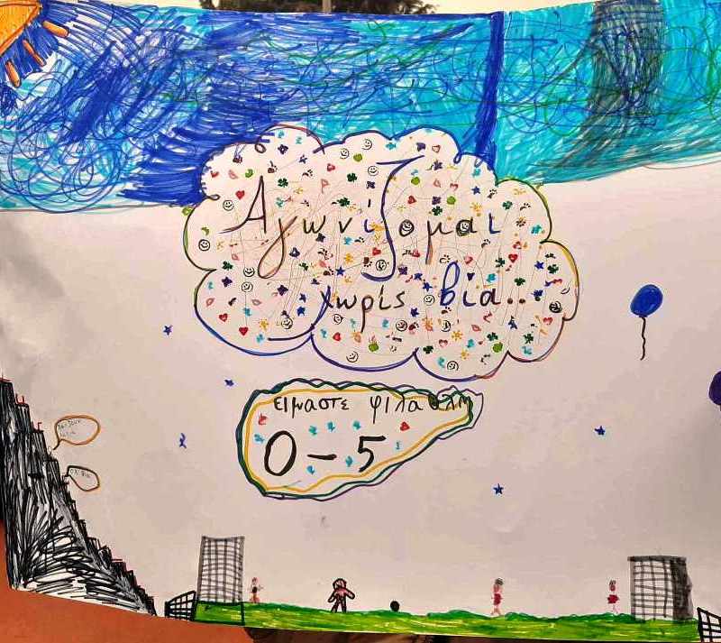 Ξεκινήσαμε με έναν αγώνα ποδοσφαίρου 7×7 στο γηπεδάκι με χλοοτάπητα που έχουμε στο σχολείο. Ποδοσφαιριστές οι μαθητές/τριες των δύο μεγάλων τάξεων και οι υπόλοιποι στο ρόλο των οπαδών των δύο ομάδων. Το τελικό αποτέλεσμα (2-2) ήταν δίκαιο, γιατί οι ομάδες ήταν ισοδύναμες. Κατόπιν, στην αίθουσα εκδηλώσεων του σχολείου, έγινε μια ενημερωτική και διαδραστική εκδήλωση για την ιδέα του αθλητισμού, τις αξίες που πρεσβεύει και για το Φίλαθλο Πνεύμα ως τρόπος ζωής. Έγινε συζήτηση για το ΄τίμιο και το ύπουλο τρόπο παιχνιδιού και αυτοκριτική για τη σημερινή συμπεριφορά μας ως αθλητές και φίλαθλοι. Προβλήθηκε το κόμικ «Μικροί Αθλητές – Όχι Βία στα Γήπεδα» και τραγουδήσαμε όλοι μαζί το «Aθλούμαστε μαζί, με ποιότητα στη ζωή». Παίξαμε διαδραστικά παιχνίδια στο wordwall (παιχνίδι 1ο – παιχνίδι 2ο) και διαβάστηκε από τα παιδιά ο «όρκος του φιλάθλου». Πέρασε από χέρι σε χέρι το σύμβολο της ειρήνης, ένα κλαδί ελιάς σύμβολο των Ολυμπιακών Αγώνων και το κλαδάκι δάφνης των Ίσθμιων, σύμβολο ειρήνης και τιμής.
