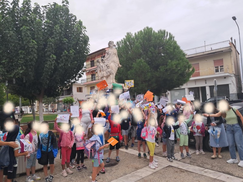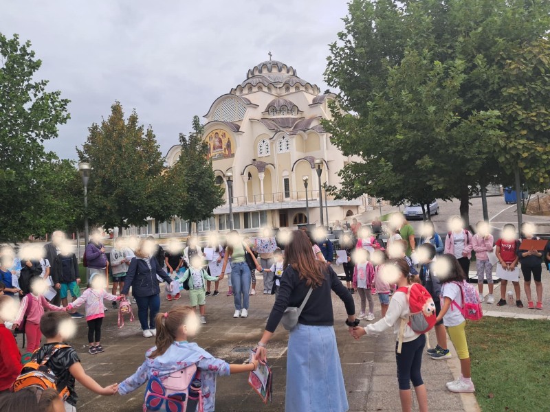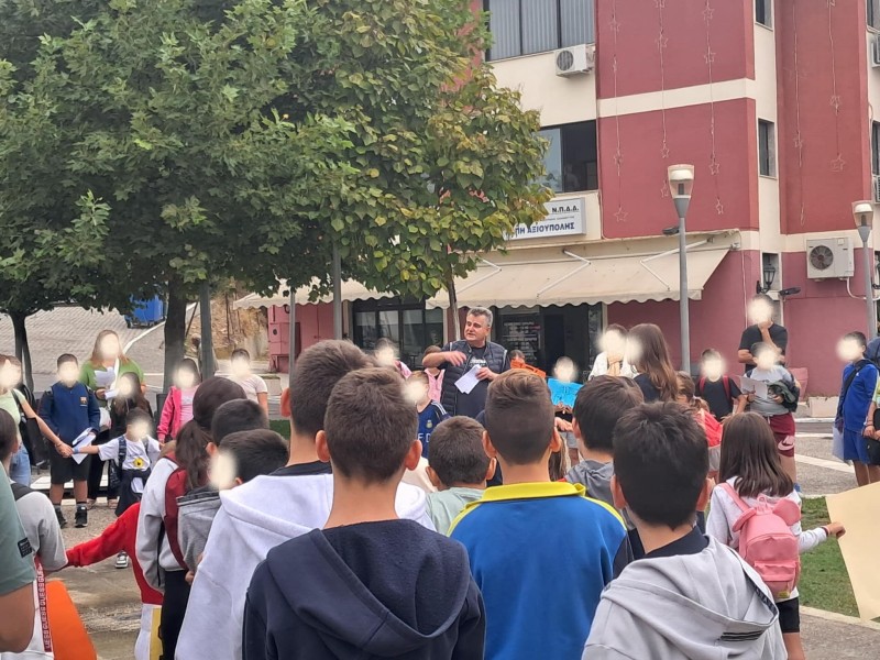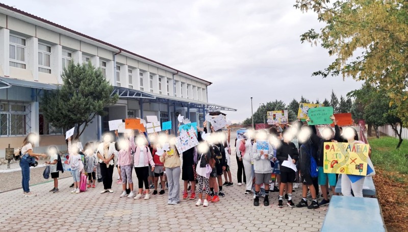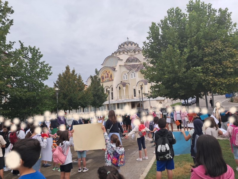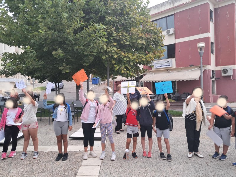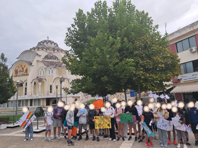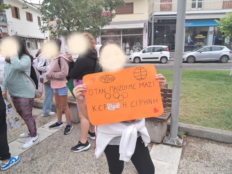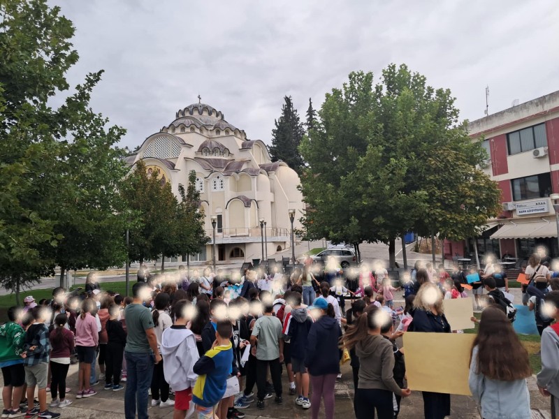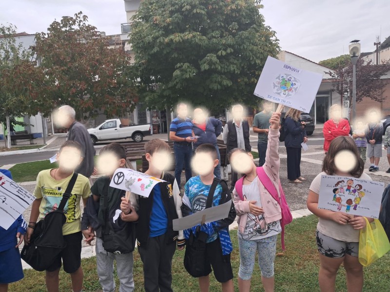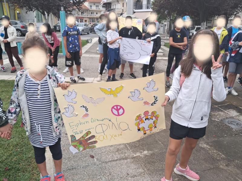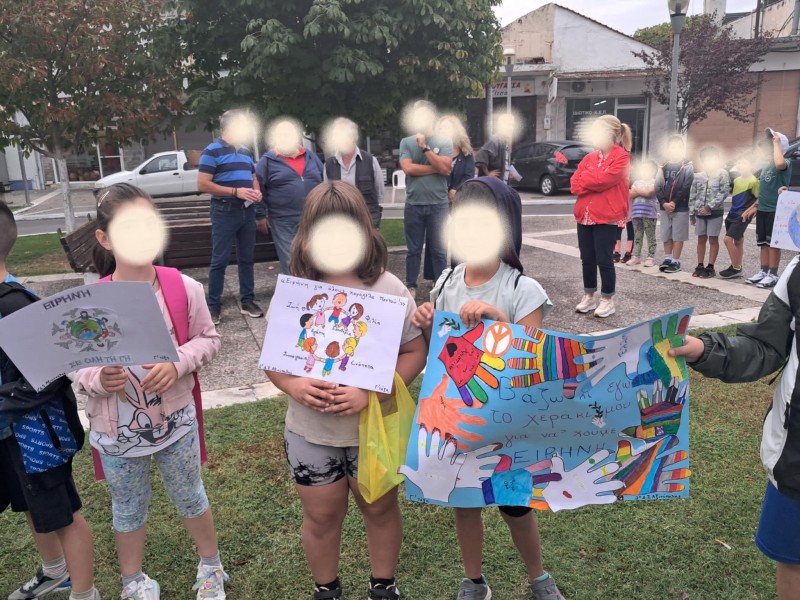 Στην πλατεία συναντήθηκαν με τους μαθητές και τις μαθήτριες του 1ου Δημοτικού Σχολείου Αξιούπολης. Εκεί σχημάτισαν με τα σώματά τους το σήμα της ειρήνης, φώναξαν τα συνθήματά τους, αντάλλαξαν τα πανό τους και τραγούδησαν με τους συμμαθητές τους το τραγούδι «Ειρήνη» του συνθέτη Γιάννη Μαρκόπουλου. 🎶