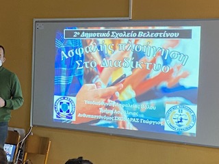 Στις 9-3–2022 επισκέφτηκε την Ε και Στ τάξη ένας αστυνομικός, σύνδεσμος της Δίωξης Ηλεκτρονικού Εγκλήματος της Αστυνομικής Διεύθυνσης Μαγνησίας προκειμένου να ενημερώσει για την ασφαλή πλοήγηση στο διαδίκτυο. Συνομίλησε μαζί τους, τους έλυσε τις απορίες, τους ανέφερε περιστατικά που είχε κληθεί να αντιμετωπίσει και τους επισήμανε τους κινδύνους που παραμονεύουν στο διαδίκτυο.
