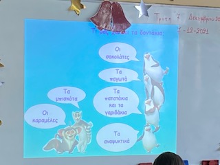 Στις 7-12-2021 επισκέφτηκε το σχολείο μας και συγκεκριμένα την Ε τάξη, η οδοντίατρος κα Μαρίνα Σαράντη η οποία έδειξε πότε και πώς πρέπει να πλένουμε τα δόντια μας, μας είπε τι πρέπει να τρώμε και πώς θα φροντίζουμε τη στοματική μας υγιεινή, κάθε μέρα. Στο τέλος έλυσε όλες τις απορίες των παιδιών σχετικά με τα δόντια τους.