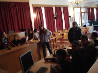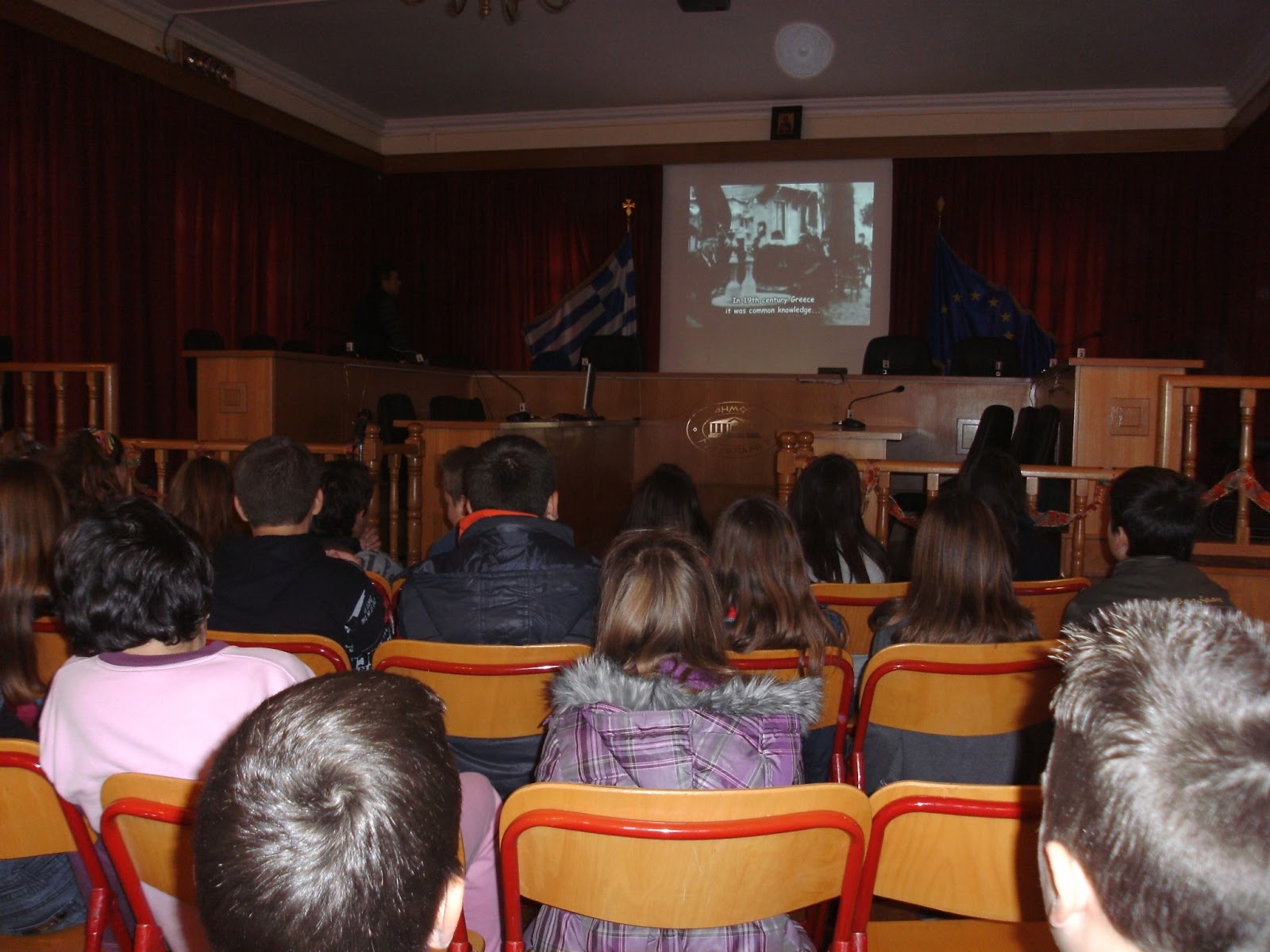 Η πρώτη στάση που κάναμε ήταν λίγο πιο πέρα από το Μουσείο γιατί το λεοφωρείο δεν χωρούσε στους στενούς δρόμους της Μεσσήνης. Περπατήσαμε λιγάκι και εκεί μας καλωσόρισε ένας κύριος και μας ζήτησε να καθήσουμε μπροστά από μια τηλεόραση.