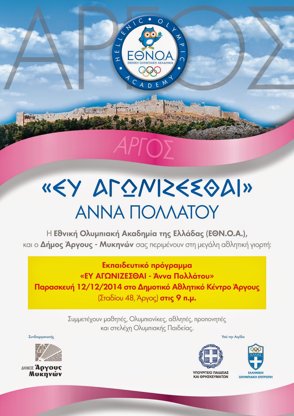 To 2o Δημοτικό Σχολείο συμμετέχει στην αθλητική γιορτή «ΕΥ ΑΓΩΝΙΖΕΣΘΑΙ – Άννα Πολλάτου» . Το συγκεκριμένο αθλητικό εκπαιδευτικό πρόγραμμα θα πραγματοποιηθεί την Παρασκευή 12 Δεκεμβρίου 2014 στο ΔΑΚ Άργους από τις 9:00 έως τις 13:00 το μεσημέρι . Στόχος του προγράμματος είναι η προώθηση του αθλητισμού στα παιδιά και του «Ευ Αγωνίζεσθαι». Εκπαιδευτές του προγράμματος θα είναι περισσότεροι από δεκαπέντε Ολυμπιονίκες καθώς και στελέχη Ολυμπιακής Παιδείας της Ακαδημίας , ομοσπονδιακοί προπονητές και πρωταθλητές.