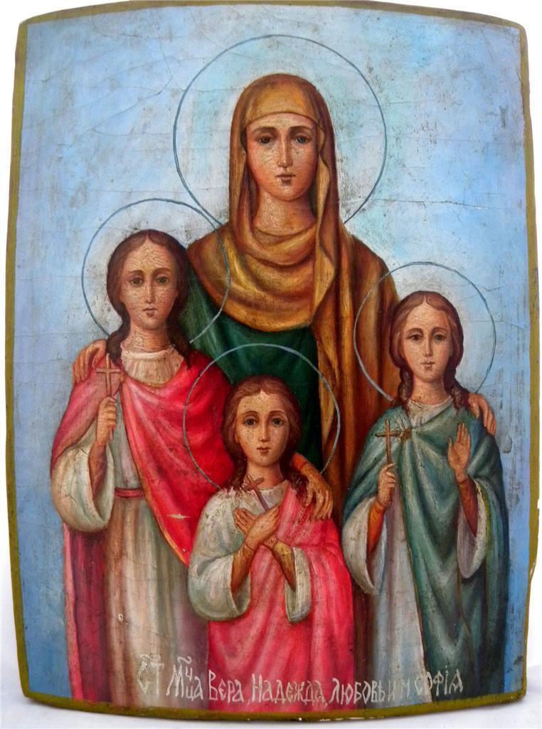 Η Αγία Σοφία και οι τρεις θυγατέρες της Πίστη, Ελπίδα και Αγάπη μαρτύρησαν στα χρόνια του αυτοκράτορα Αδριανού (117 – 138 μ.Χ.). Οι τρεις θυγατέρες της Αγίας Σοφίας, πήραν τα ονόματα τους από το χωρίο της Καινής Διαθήκης: «νυνί δέ μένει πίστις, ελπίς, αγάπη, τά τρία ταύτα, μείζων δέ τούτων η αγάπη.» ( Α’ Κορινθίους. 13:13).