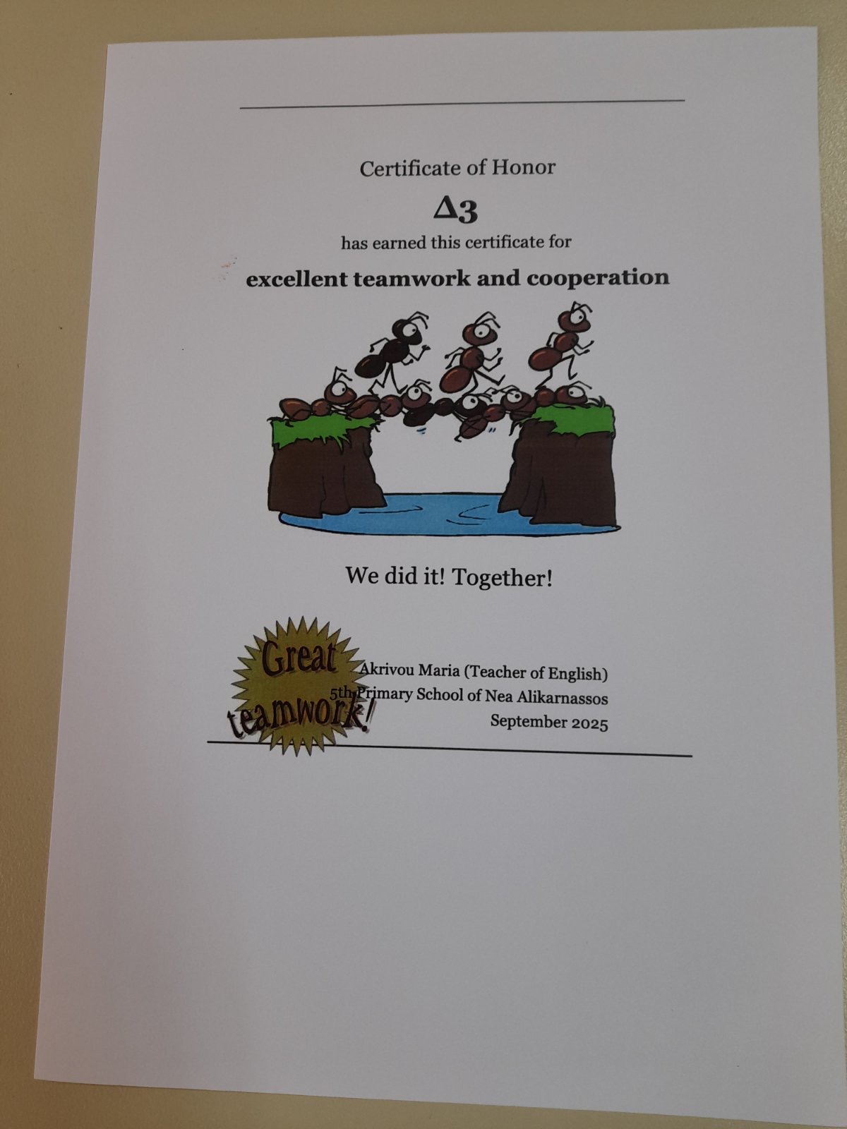 Πρώτη αποστολή εξετελέσθη και προχωράμε στις επόμενες αφού πρώτα οι μαθητές πήραν πτυχία εξαιρετικής ομαδικής εργασίας και συνεργασίας και είναι έτοιμοι για να συνεργαστούν στις τάξεις τους με επιτυχία τους επόμενους μήνες!