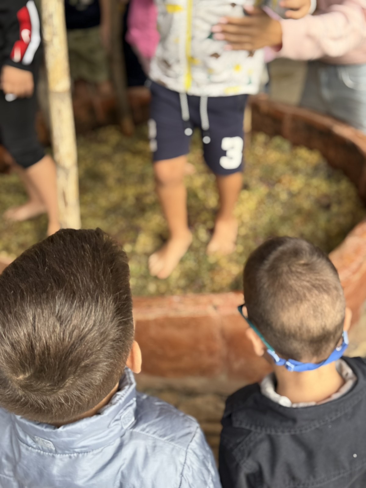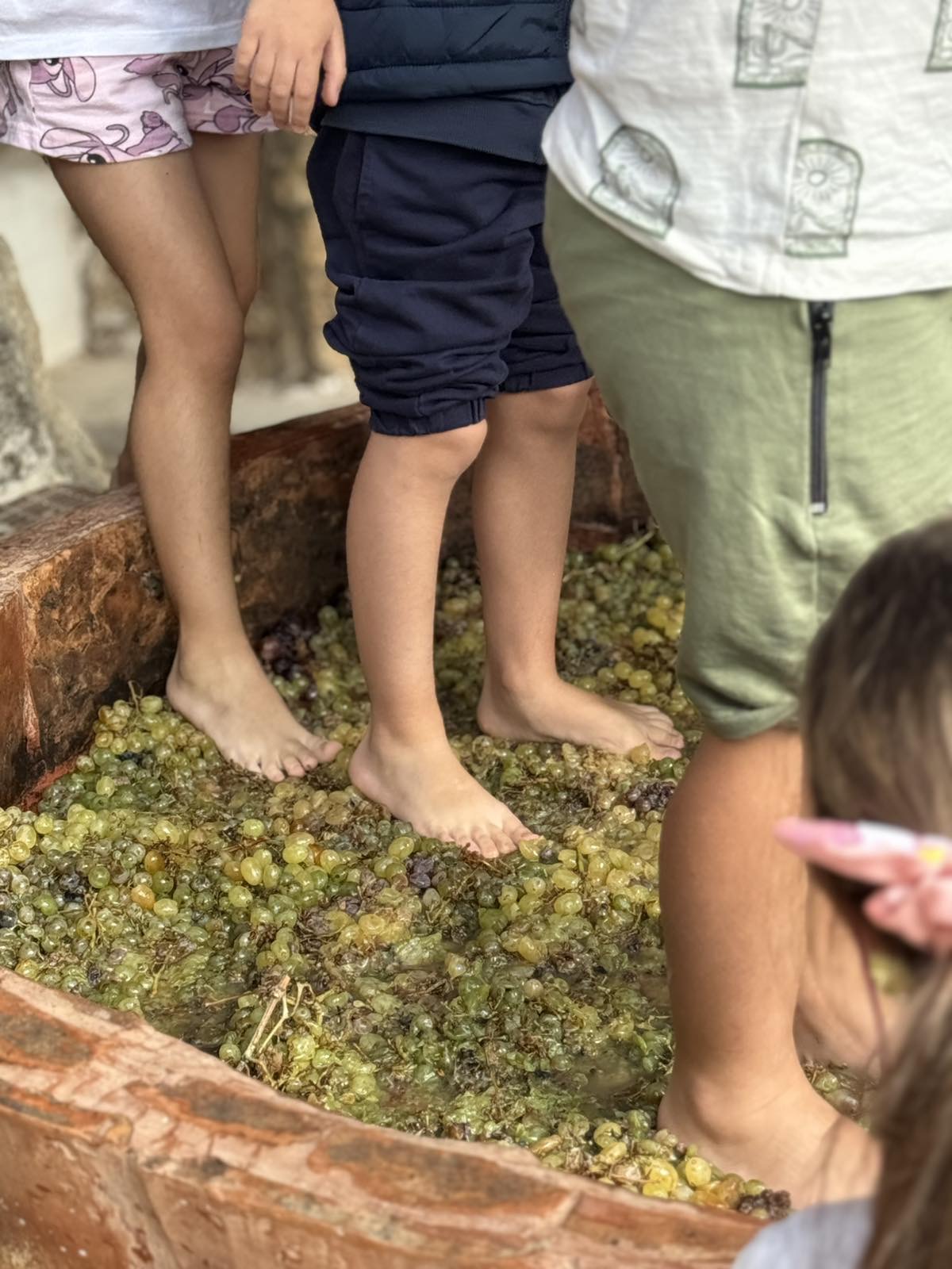 Τα παιδιά έμαθαν πώς γινόταν παλιά το πάτημα των σταφυλιών και φυσικά…το δοκίμασαν και τα ίδια! Με ενθουσιασμό έπλυναν ποδαράκια και μπήκαν στο πατητήρι, πάτησαν τα σταφύλια και είδαν πώς βγαίνει ο πολύτιμος μούστος!