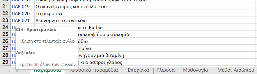 Ο κατάλογος των βιβλίων είναι σε υπολογιστικό αρχείο (xls). Πατώντας στον παρακάτω σύνδεσμο ο κατάλογος κατεβαίνει στον υπολογιστή σας. Ανοίξτε το αρχείο και τοποθετήστε το ποντίκι σας στο πράσινο βελάκι της κάτω μπάρας, όπως στην εικόνα.
