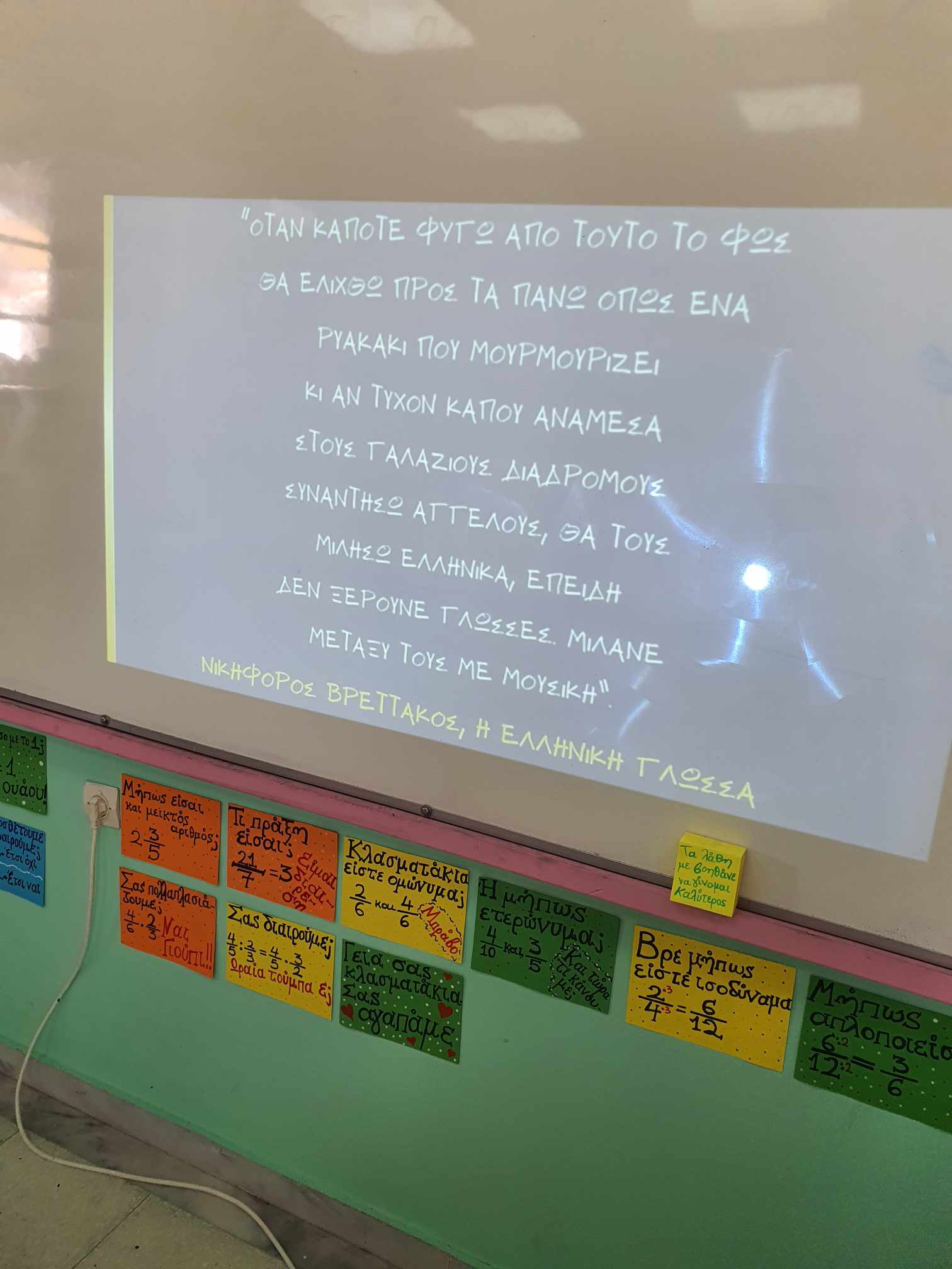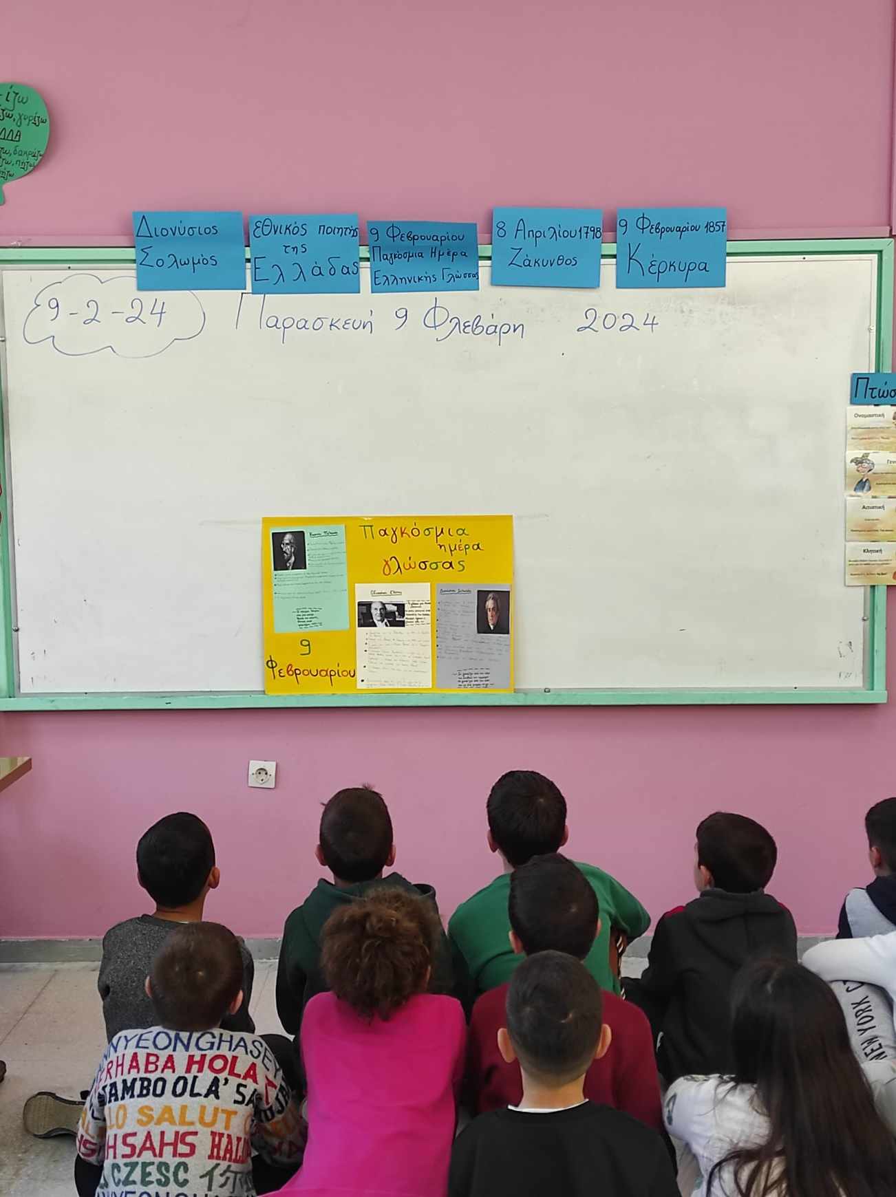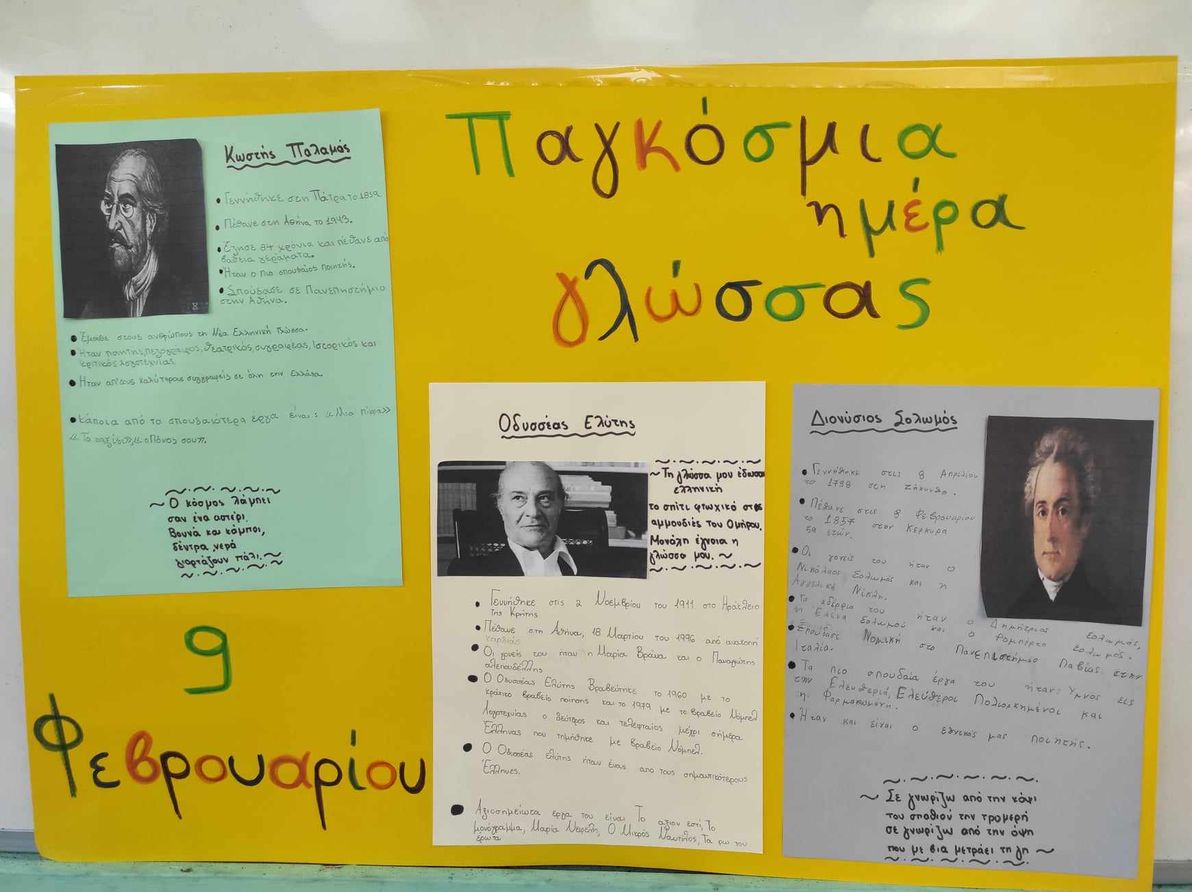 Σήμερα Παρασκευή, 9/2/2024 τιμήσαμε στο σχολείο μας την Παγκόσμια Ημέρα Ελληνικής Γλώσσας. Με την επιμέλεια των εκπαιδευτικών του σχολείου αλλά και με την υποστήριξη των συναδέλφων άλλων ειδικοτήτων, αφού παρακολουθήσαμε ενημερωτικά ντοκιμαντέρ, πραγματοποιήθηκε φιλαναγνωσία ποιητικών έργων Ελλήνων ποιητών σε κάθε τάξη.