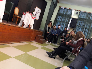 Η μέρα ξεκίνησε με τη κατανυκτική Θεία Λειτουργία που τέλεσε ο εφημέριος π.Νεκτάριος Κουκούλης στο ναό, μόνο για τα παιδιά του Γυμνασίου. Μετά τις ευχές και τα ζεστά λόγια αγάπης του, οι μαθητές επέστρεψαν στο Γυμνάσιο. Μέσα στην αίθουσα εκδηλώσεων παρουσιάστηκε το μονόπρακτο