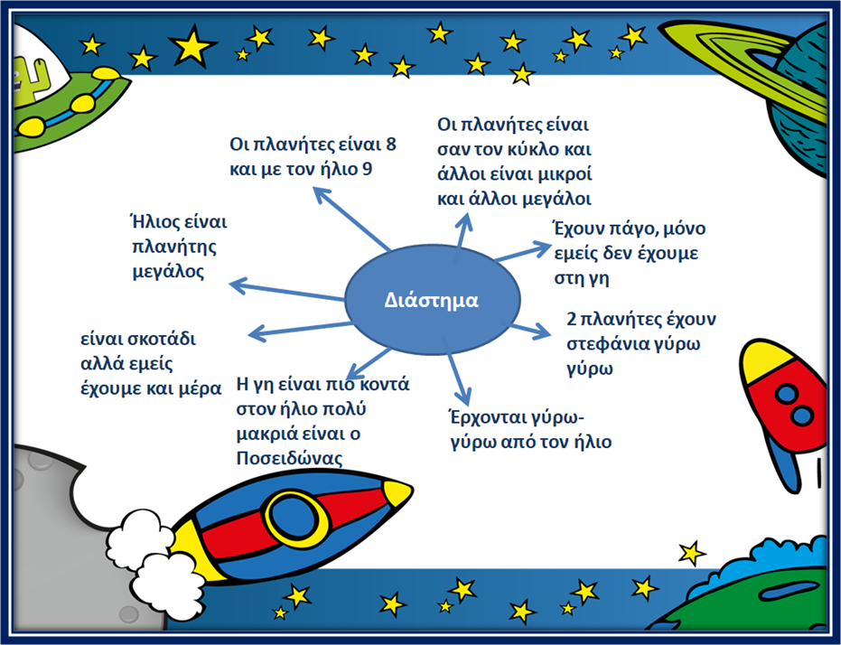 Διερευνούμε τις πρότερες γνώσεις των παιδιών, συζητάμε τι γνωρίζουν οι μαθητές για το διάστημα και τι θα ήθελαν να μάθουν και γράφουμε στον πίνακα όλες τις ιδέες που έχουν οι μαθητές.