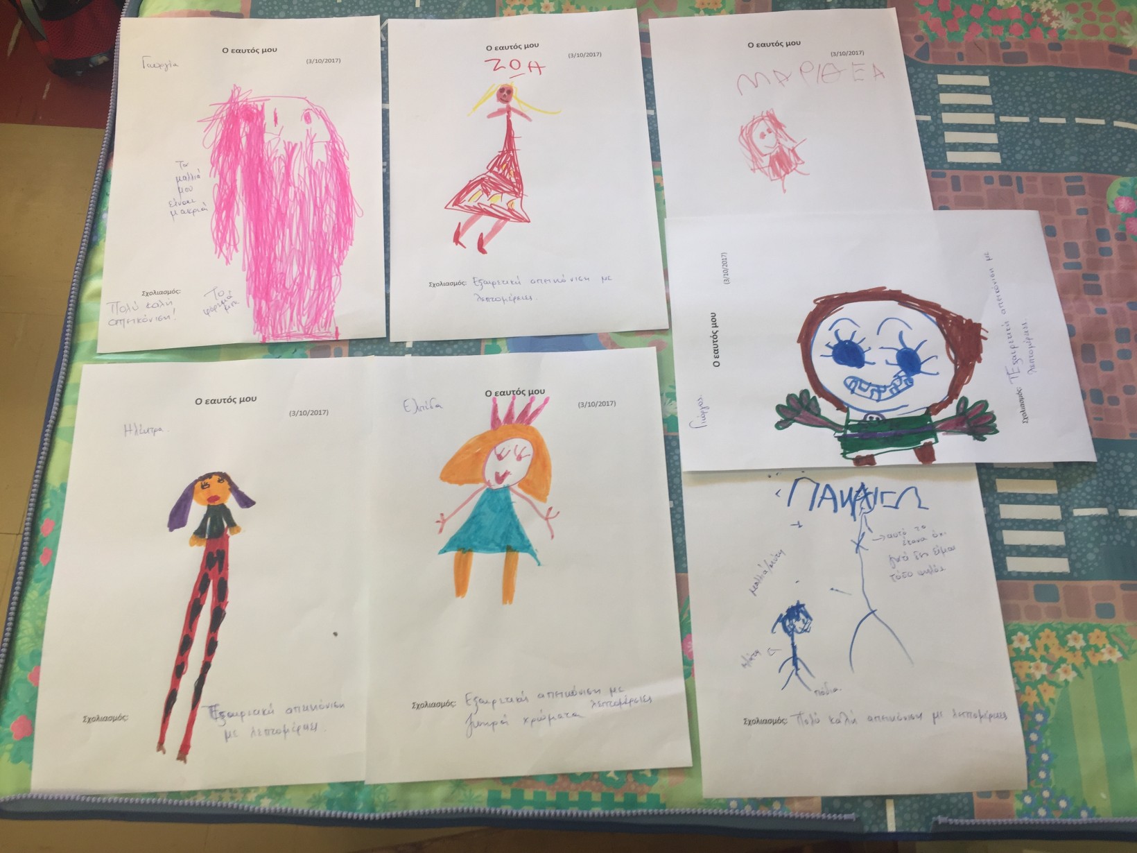 Χρησιμοποιώντας τον καθρέπτη το κάθε παιδί περιγράφει τα εξωτερικά χαρακτηριστικά του. Παρατηρούμε ότι έχουμε ομοιότητες και διαφορές. Σχηματίζουμε ομάδες με κριτήριο όμοια εξωτερικά χαρακτηριστικά : καστανά, ξανθά, μαύρα μαλλιά, καστανά, μπλε, πράσινα μάτια, κοντά, μακριά μαλλιά κ.α.
