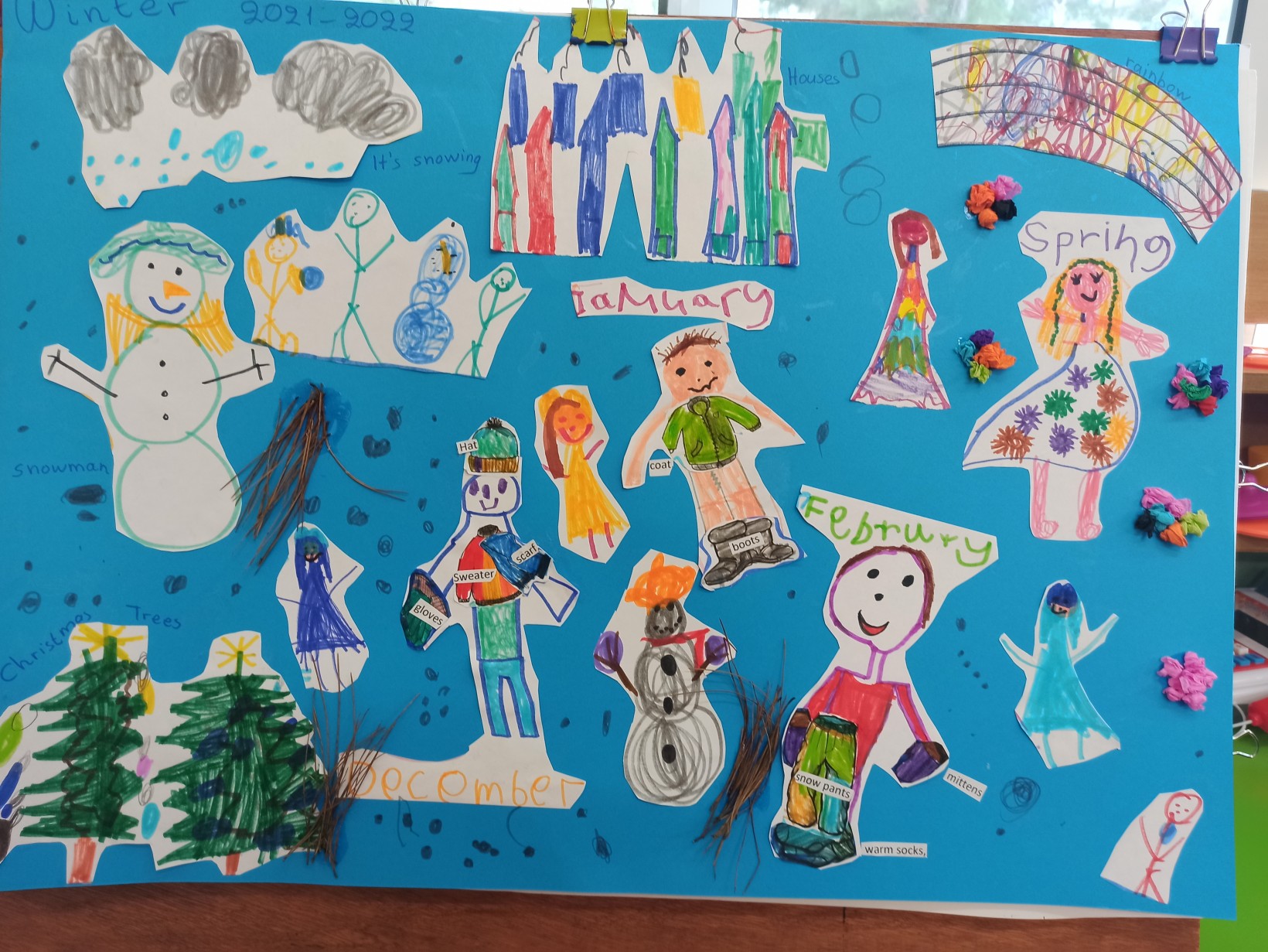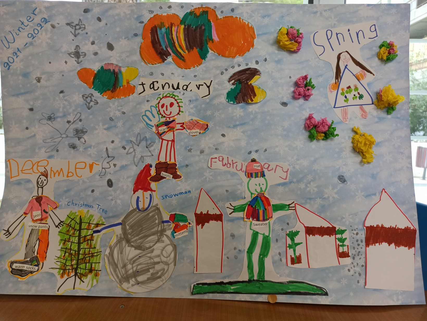 Ο/η νηπιαγωγός κατά τις ώρες των δραστηριοτήτων στην αγγλική γλώσσα παραμένει στην τάξη λαμβάνοντας ενεργό μέρος στη μαθησιακή διαδικασία, με βάση τις ανάγκες και την οργάνωση των δραστηριοτήτων, όπως συναποφασίζονται από τους δύο εκπαιδευτικούς. Σκοπός της ενσωμάτωσης της αγγλικής γλώσσας στο Νηπιαγωγείο είναι ο εμπλουτισμός του προγράμματος σε σχέση με τη γλωσσική και ολόπλευρη ανάπτυξη των νηπίων για την ενίσχυση της πολυγλωσσικής επίγνωσης, της διαπολιτισμικής επικοινωνίας και τη διαμόρφωση της ταυτότητας του ενεργού πολίτη στη σύγχρονη πολυπολιτισμική κοινωνία. Οι παρακάτω εργασίες έγιναν με υπεύθυνη εκπαιδευτικό την κα Αγγελική στο project εποχές