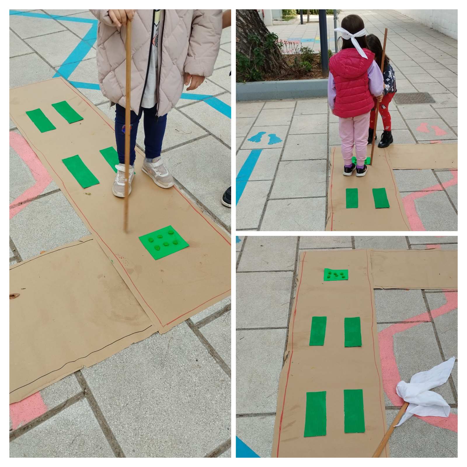 Με αφορμή την Παγκόσμια Ημέρα Ατόμων με Αναπηρία και στο πλαίσιο του σχεδίου δράσης “Όλοι Διαφορετικοί, όλοι μαζί”, υλοποιήσαμε στο σχολείο μας ένα σύνολο στοχευμένων δραστηριοτήτων με σκοπό την ευαισθητοποίηση των μαθητών απέναντι στα άτομα με οπτική αναπηρία ή κινητικές δυσκολίες . Οι μαθητές είχαν την ευκαιρία να γνωρίσουν βασικές αρχές προσανατολισμού και κινητικότητας, περπατώντας με λευκό μπαστούνι πάνω σε ανάγλυφο πεζοδρόμιο-προσομοίωση οδηγού για τυφλούς, στην αυλή.