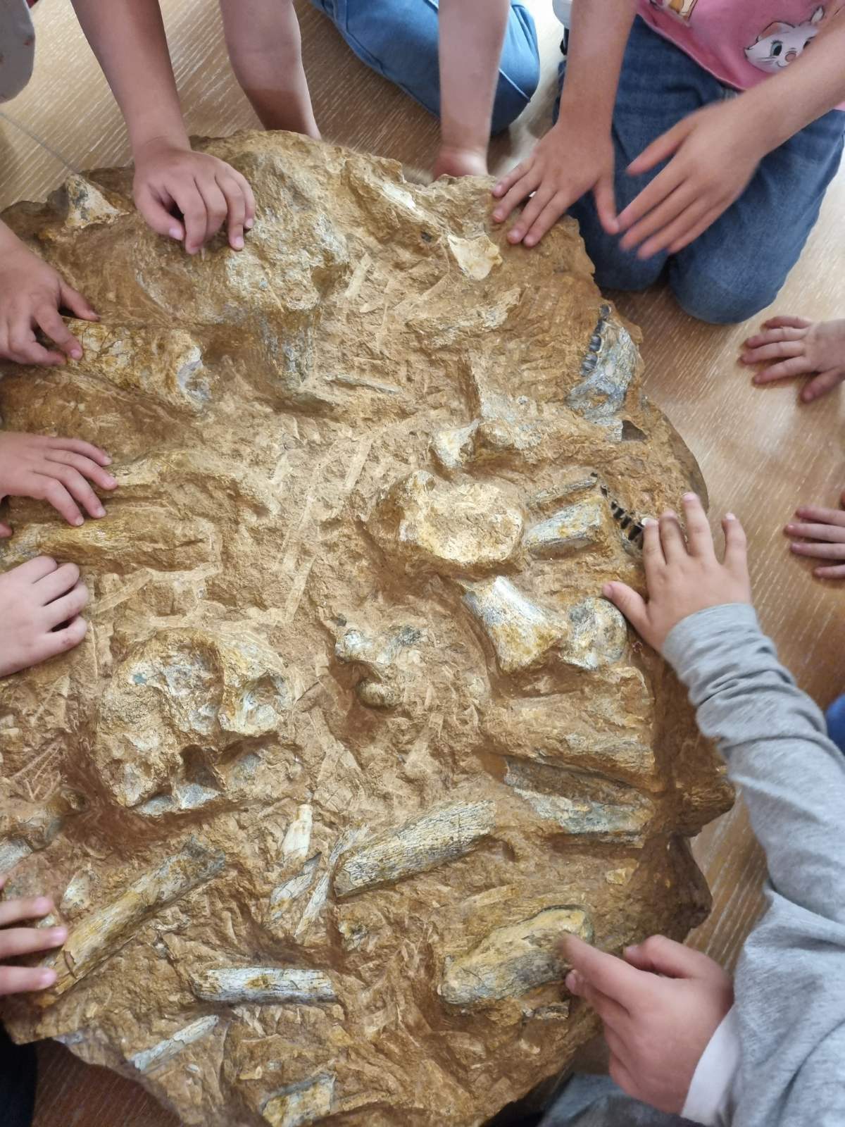 Τα παιδιά γνώρισαν μερικά από τα σημαντικότερα απολιθώματα που βρέθηκαν στην Ελλάδα, αλλά και απολιθώματα-σταθμούς στην ιστορία της εξέλιξης της ζωής πάνω στη γη, επιχειρώντας ένα ταξίδι πίσω στο χρόνο με οδηγό τα απολιθώματα. Θαύμασαν τα πρωτόγονα ιππάρια, τους μαχαιρόδοντες, τις γαζέλες, τις καμηλοπαρδάλεις, τους ρινόκερους , τις ύαινες που έζησαν περίπου 7 εκατομμύρια χρόνια πριν. Εντυπωσιάστηκαν βλέποντας ένα αντίγραφο σκελετού Μοσάσαυρου (Mosasaurus) , αποτύπωμα δεινοσαύρου καθώς και τη φυσική αναπαράσταση νάνου ελέφαντα και μιας γιγαντιαίας χελώνας.
