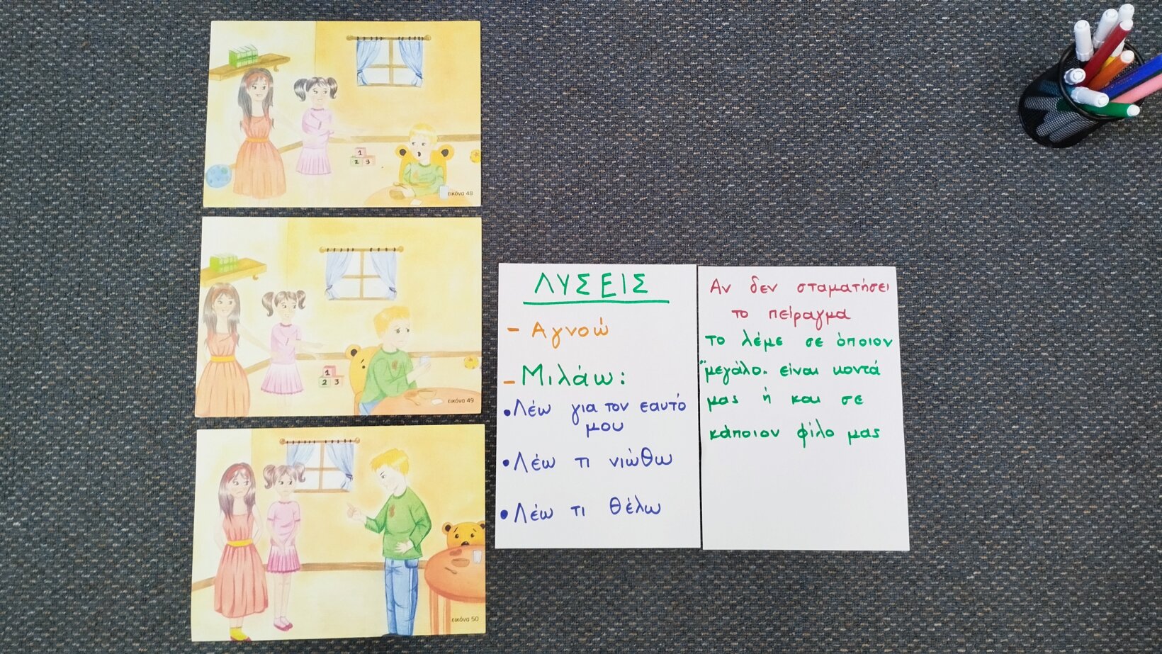 Προηγήθηκαν τα μαθήματα , ”Νοιάζομαι, βοηθάω”, ”Παίζουμε και φερόμαστε δίκαια”, ”Μαθαίνω να λέω όχι”, ”Τι μπορώ να κάνω όταν με πειράζουν ή με κοροϊδεύουν” από το Πρόγραμμα Ατομικών και Κοινωνικών Δεξιοτήτων για το νηπιαγωγείο – Βήματα για τη Ζωή των Νάντια Κουρμούση και Βασίλη Κούτρα.