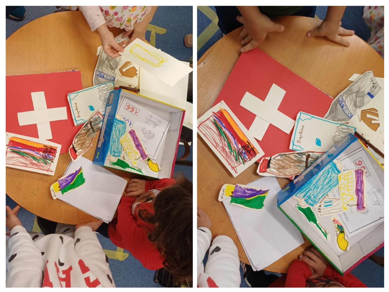 Ζωγράφισαν και ομοιώματα των αντικειμένων του κουτιού (φάρμακα, ορός, γάζα, φακός, μάσκες …) ώστε να μπορούν να παίζουν με αυτά.