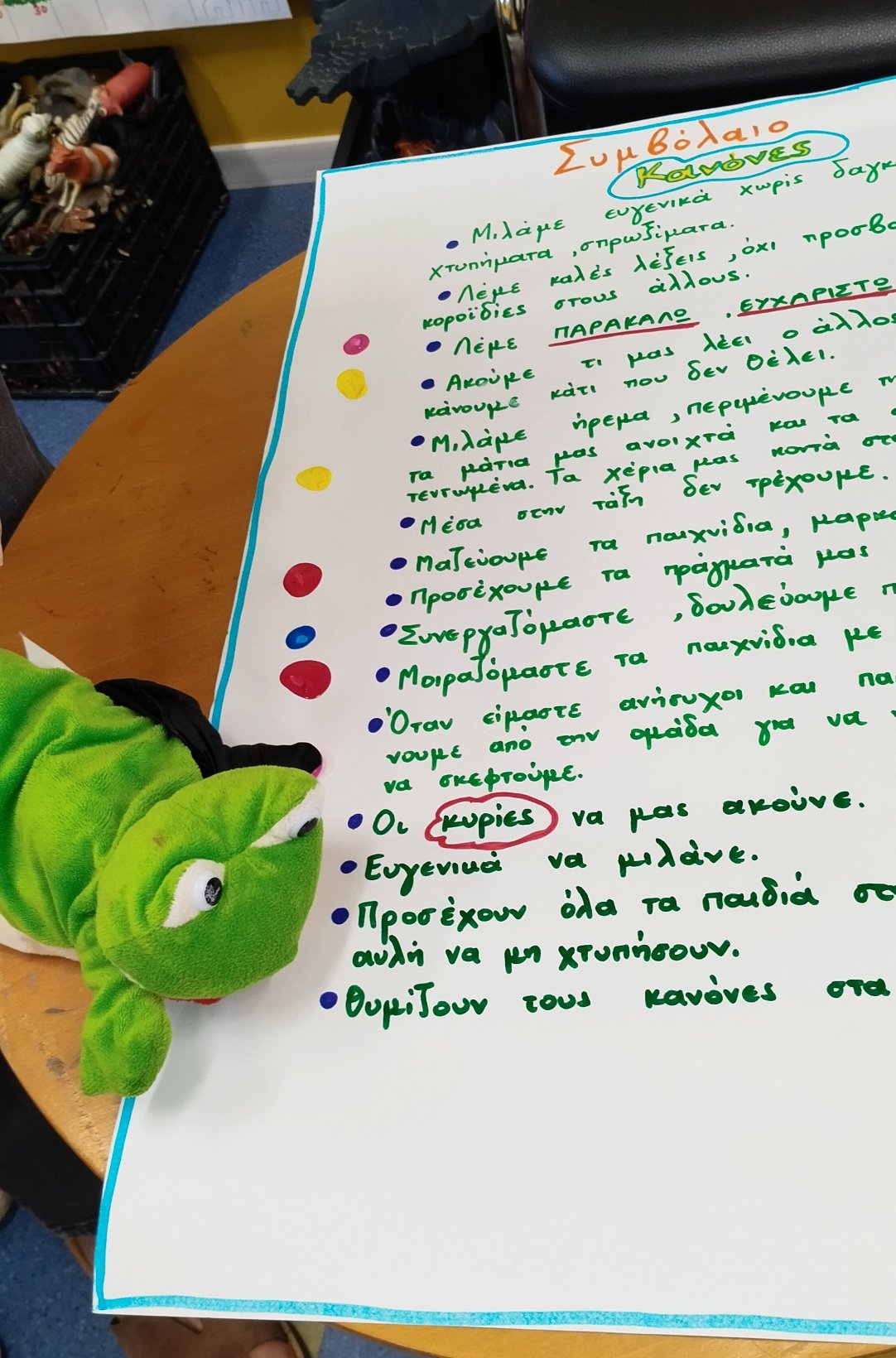 Μέσα από το μάθημα ”ΚΑΝΟΝΕΣ” του Προγράμματος Ατομικών και Κοινωνικών Δεξιοτήτων για το νηπιαγωγείο – Βήματα για τη Ζωή και με τη βοήθεια του βάτραχου-φίλου μας Γκόργκι, παίξαμε παιχνίδια ρόλων(παιδί που γνωρίζει τους κανόνες /παιδί που τώρα τους μαθαίνει) και διατυπώσαμε τις θετικές και αρνητικές συμπεριφορές. Μιλήσαμε και για τους κανόνες στην οικογένειά μας και σε άλλες καταστάσεις.