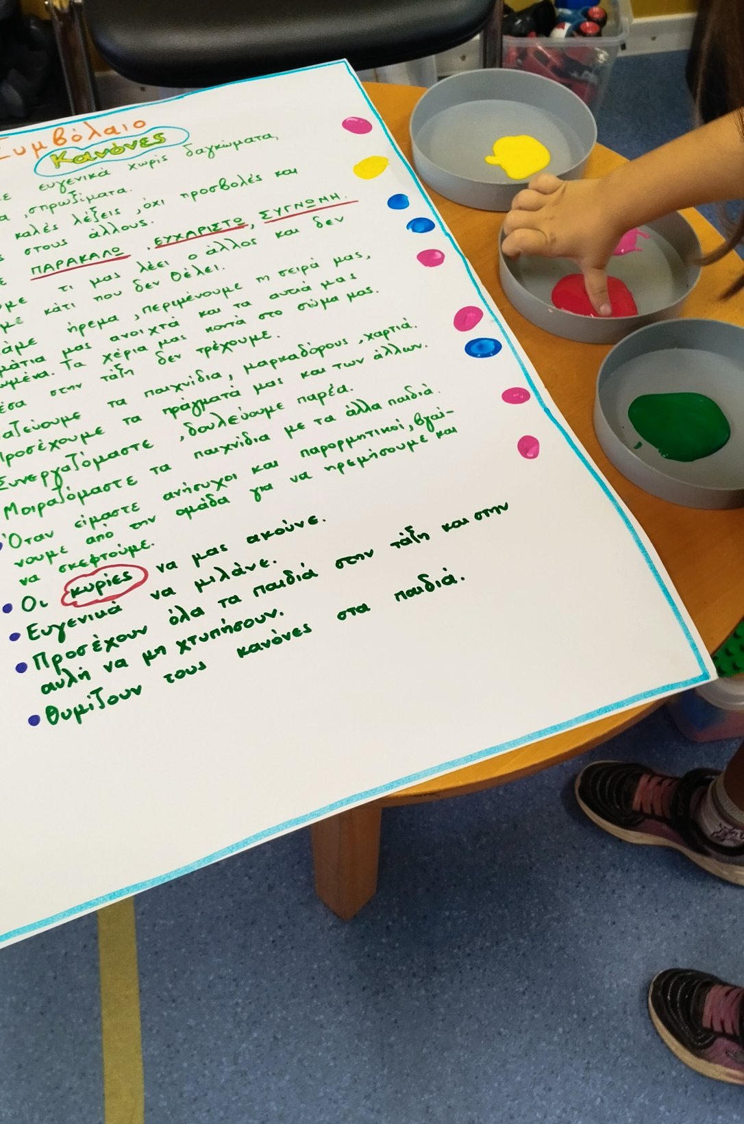 Φτιάξαμε το Συμβόλαιο της τάξης μας με τους κανόνες και το υπογράψαμε με το δαχτυλικό μας αποτύπωμα, δίνοντας την υπόσχεση ότι θα τους ακολουθήσουμε. Φυσικά αυτό το συμβόλαιο το υπογράφουν και οι κυρίες.