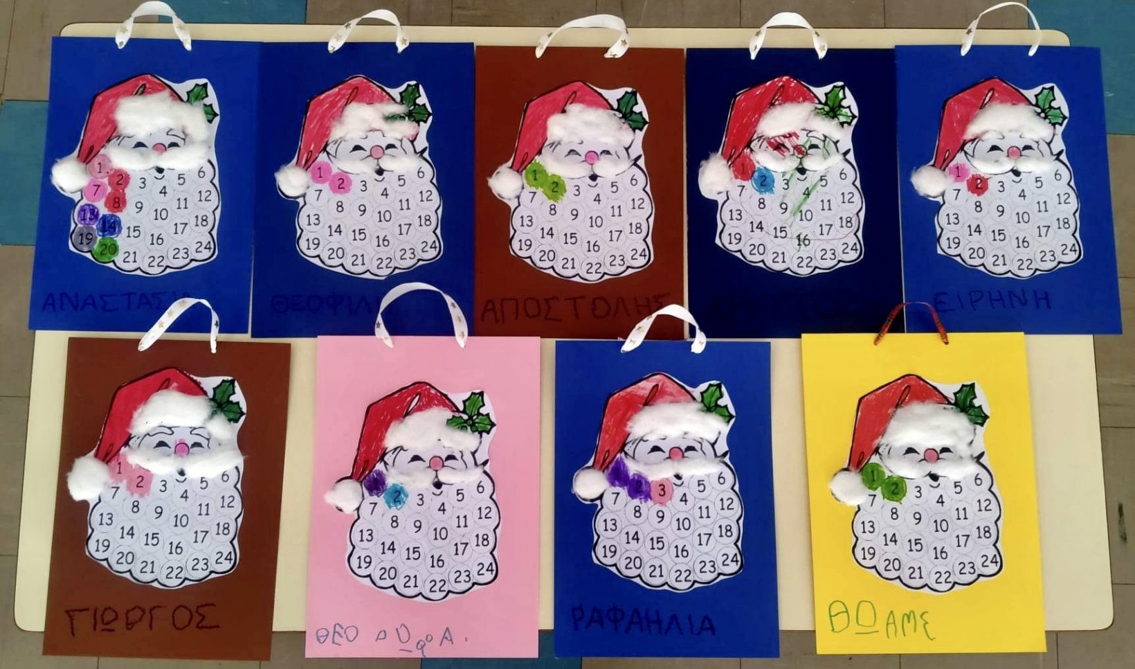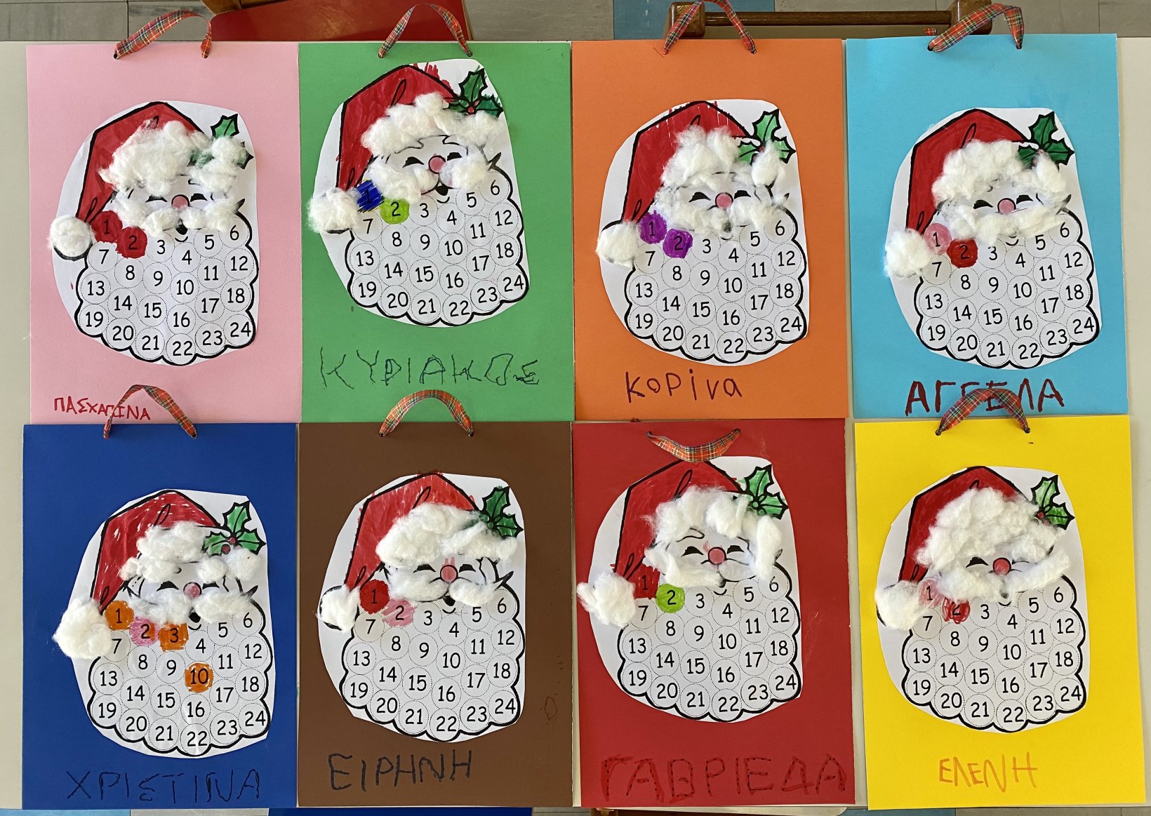 Τέλος, το κάθε παιδί έφτιαξε το δικό του Ημερολόγιο αντίστροφης μέτρησης των Χριστουγέννων! Ειδικότερα, οι μαθητές κόλλησαν βαμβάκι στον σκούφο, τα φρύδια και το μουστάκι του Άγιου Βασίλη και χρωμάτισαν τον σκούφο του. Κάθε ημέρα που περνάει, θα χρωματίζουν τον αριθμό που της αντιστοιχεί, μέχρι να φτάσουμε στις 25 Δεκεμβρίου.