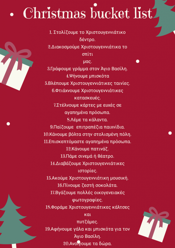 Σε αυτή τη Χριστουγεννιάτικη bucket list μπορείτε να πάρετε μερικές απλές ιδέες, για να περάσετε όμορφα με τους αγαπημένους σας αυτές τις γιορτές.