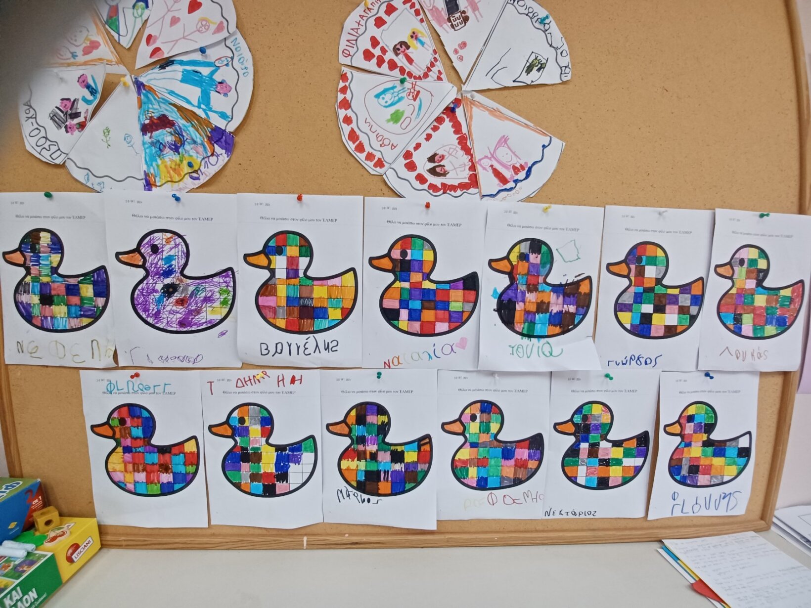 Την επόμενη ημέρα αφού ανάρρωσε ο Παπίνος μας, μας εξήγησε πως θέλει να πάει να βρει τους φίλους του. Εμείς του γνωρίσαμε τον Έλμερ, τον χρωματιστό ελέφαντα, που είναι και αυτός διαφορετικός και ταυτόχρονα μοναδικός! Διαβάσαμε λοιπόν την ιστορία του Έλμερ και χρωματίσαμε ένα παπάκι που ήταν σαν τον Έλμερ…