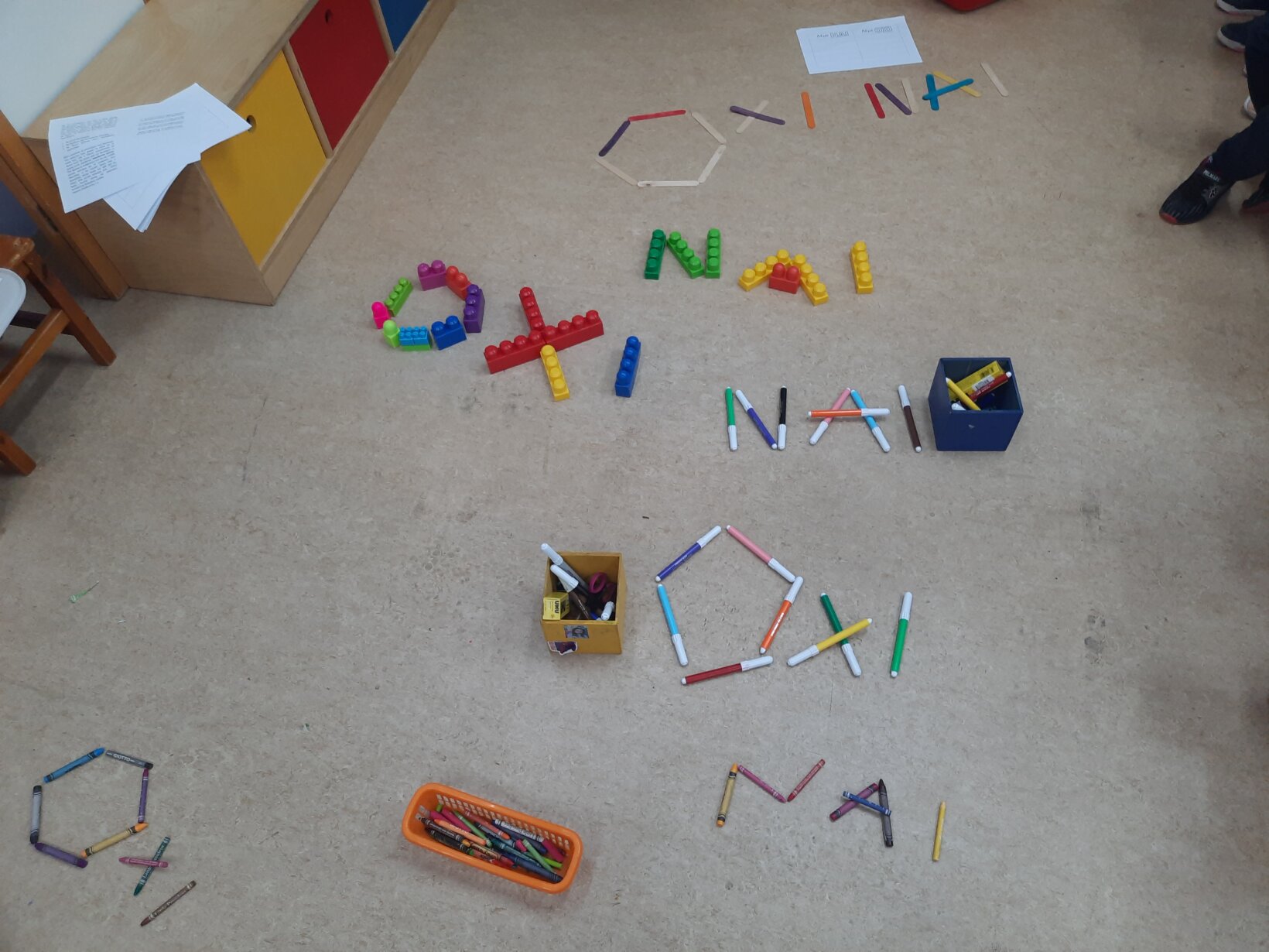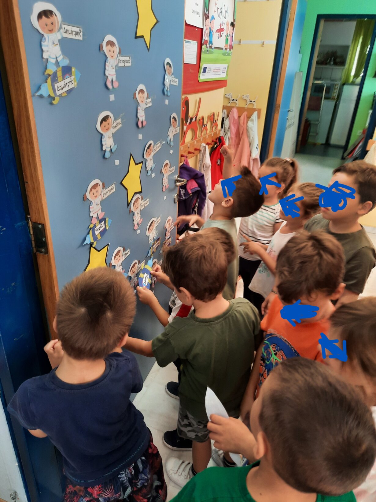 Για αρχή παίξαμε ένα κινητικό παιχνίδι όπου τα παιδιά κάθε φορά που σταματούσε η μουσική έπαιρναν έναν πύραυλο με ένα όνομα και προσπαθούσαν να δουν αν βρήκαν το δικό τους ταυτοποιώντας το στο αστροπαρουσιολόγιο της πόρτας