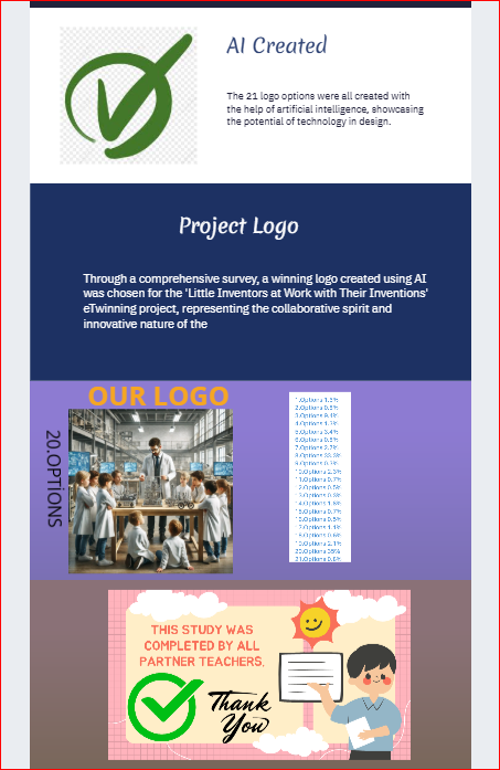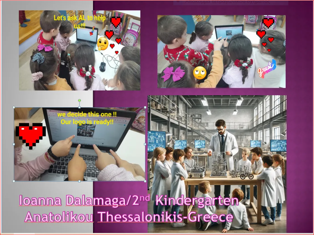 -Τραγούδι Φιλίας Μικρών Εφευρετών: Το πρώτο μας σημαντικό αποτέλεσμα ήταν η δημιουργία του Τραγουδιού Φιλίας Μικρών Εφευρετών . Αρχικά, οι μαθητές, με την καθοδήγηση των δασκάλων τους, έγραψαν τους στίχους σε συνεργασία χρησιμοποιώντας το εργαλείο Canva. Στη συνέχεια, χρησιμοποιήσαμε ένα εργαλείο Τεχνητής Νοημοσύνης για να μετατρέψουμε τους στίχους τους σε τραγούδι — έναν όμορφο εορτασμό της φιλίας που γεννήθηκε μέσα από την ομαδική εργασία. Επιπλέον, οι μαθητές απεικόνισαν τα οράματά τους για τη φιλία και όλα τα σχέδιά τους συλλέχθηκαν και παρουσιάστηκαν σε μια συνεργατική ψηφιακή παρουσίαση που δημιουργήθηκε με το Canva.