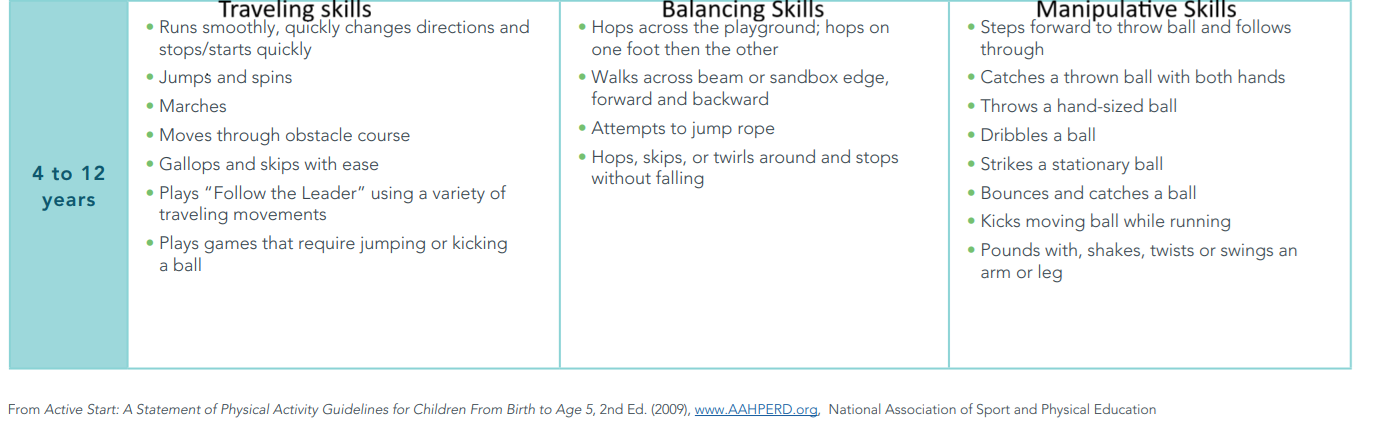 Ως αδρή κινητικότητα αναφέρεται στην ικανότητα του παιδιού να ελέγχει τα μεγαλύτερα μέρη του σώματός του (χέρια, πόδια) συμπεριλαμβανομένου της ισορροπίας, του συντονισμού κινήσεων, του ελέγχου, μετακίνησης και σταθερότητας. Λεπτή κινητικότητα ορίζεται το επίπεδο συντονισμού και η ικανότητα χρήσης μικρότερων μερών του σώματος (όπως η χρήση του αντίχειρα και του δείκτη για να πάρουμε μία σταφίδα) (dhs winsconsin).