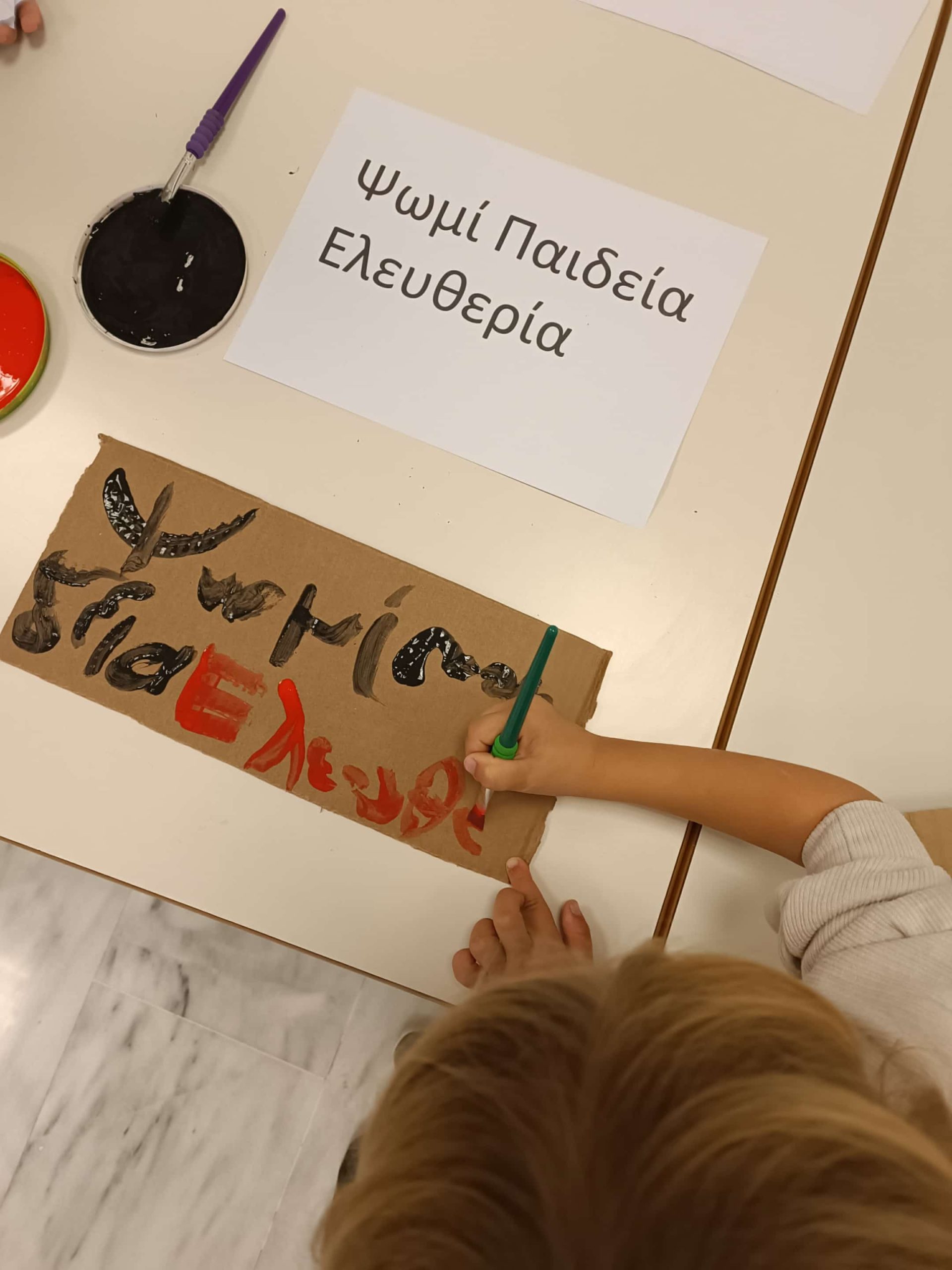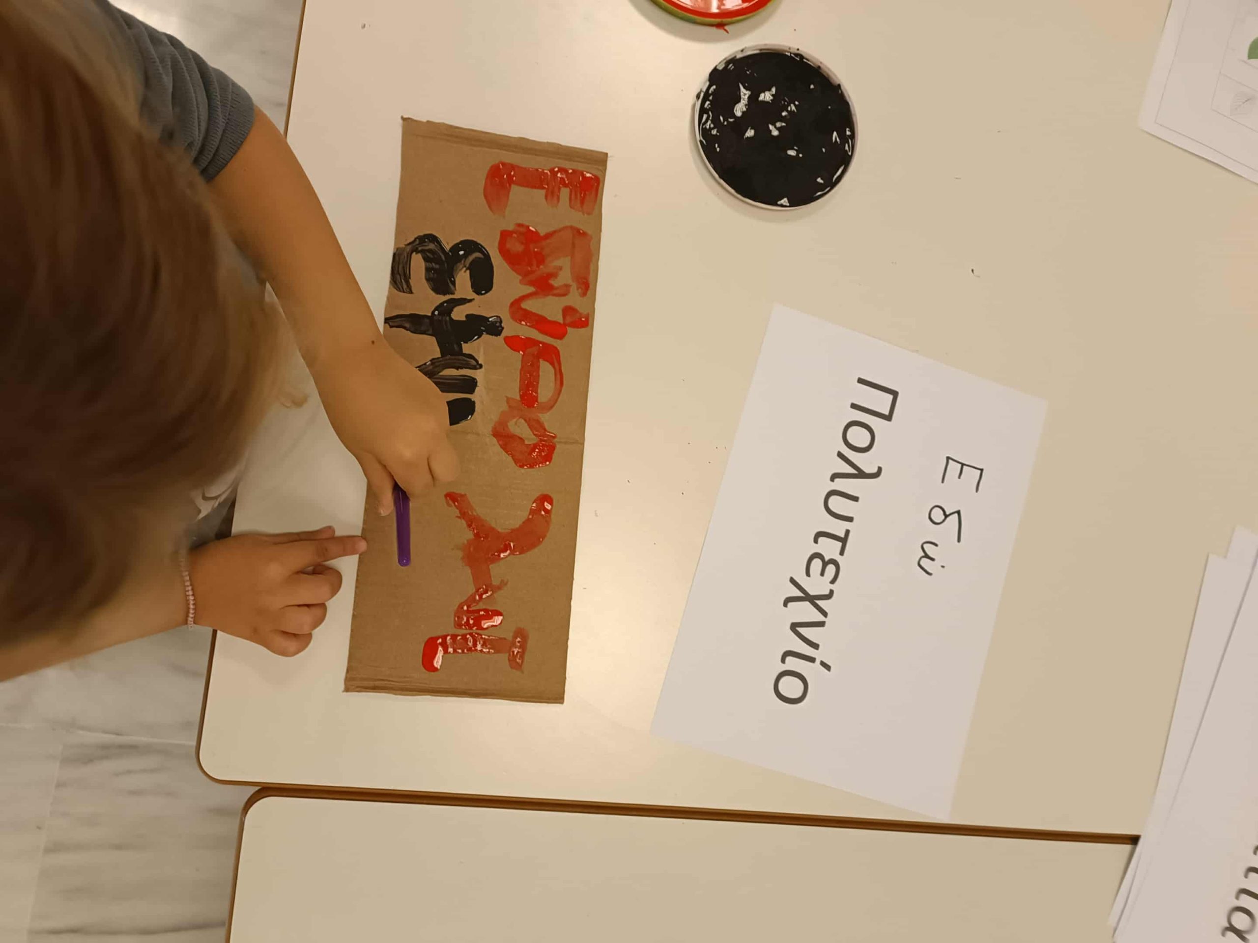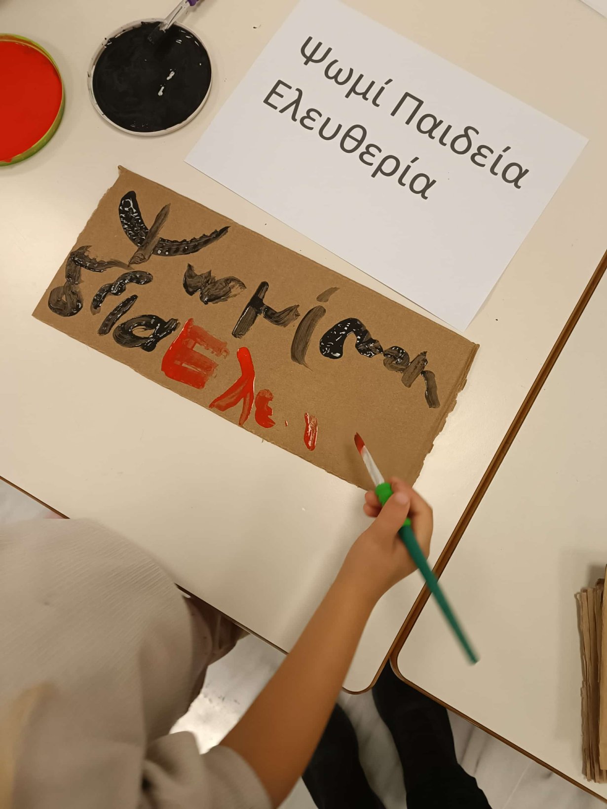 Έγραψαν συνθήματα όπως “Ψωμί, Παιδεία, Ελευθερία” πάνω σε πλακάτ από χαρτόκουτα και έκαναν μια αφίσα με κόκκινο γαρύφαλλο για να τιμήσουν τη μνήμη όσων βρίσκονταν μέσα στο Πολυτεχνείο.