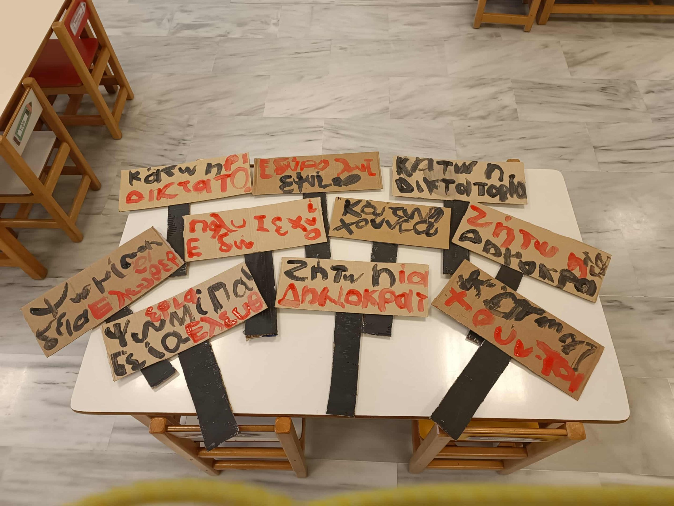 … δραματοποίησαν την εξέγερση του Πολυτεχνείου λέγοντας συνθήματα και κρατώντας ψηλά τα πλακατ που τα ίδια δημιούργησαν…