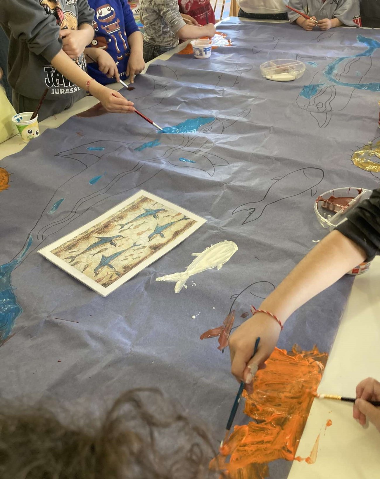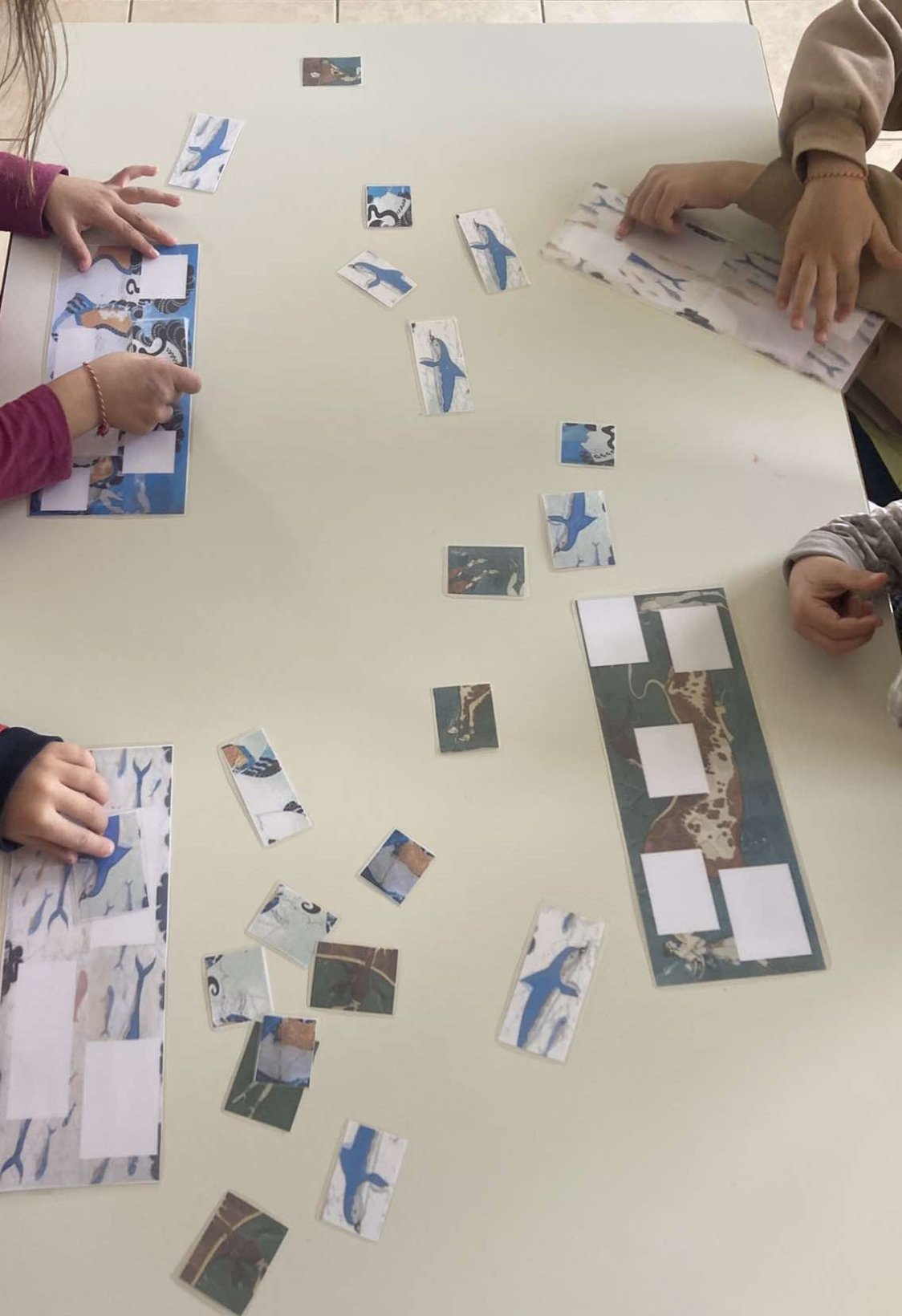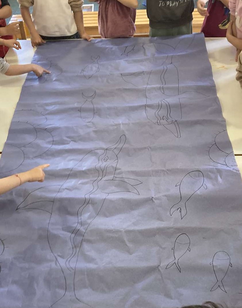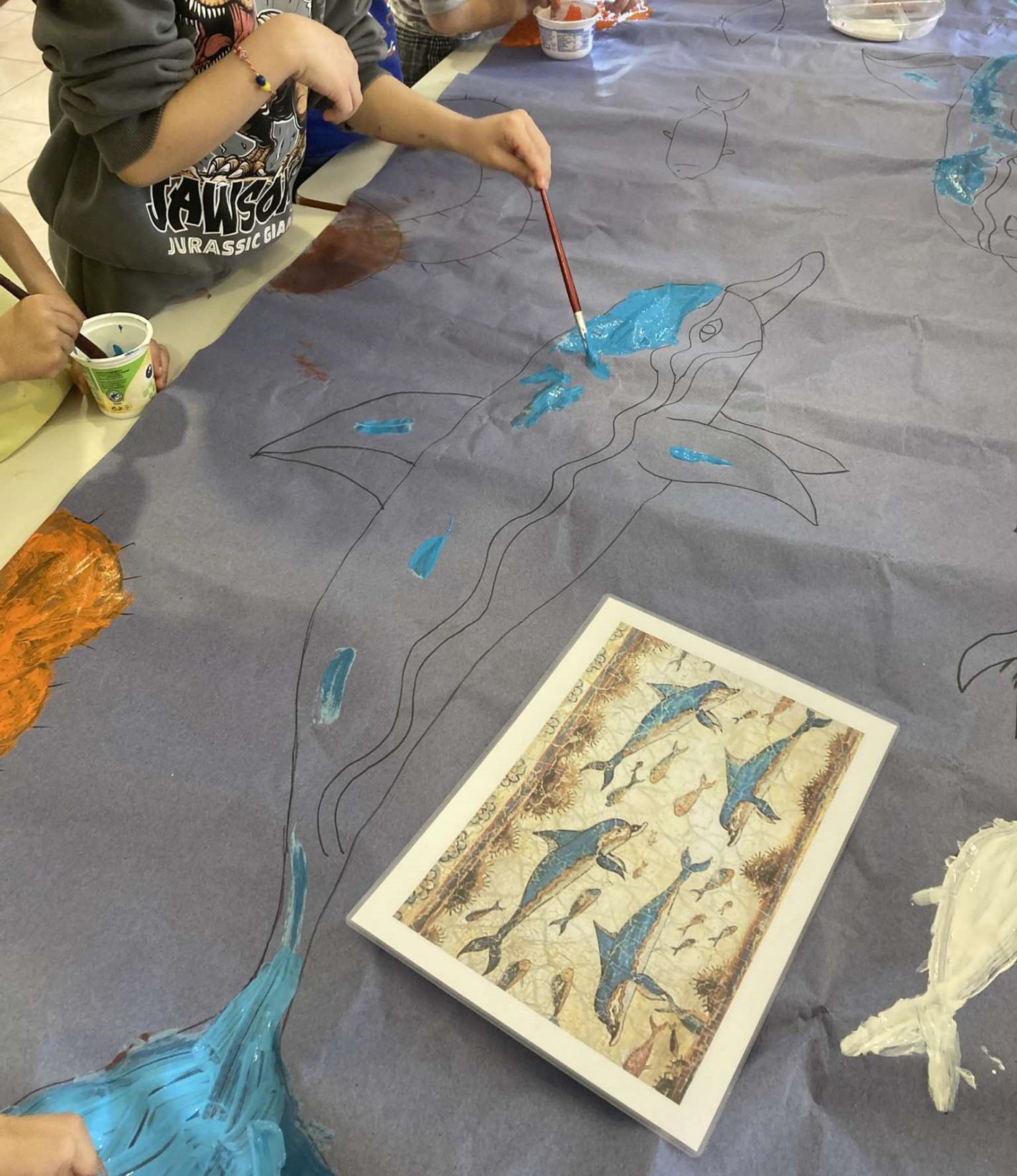 Στη συνέχεια, γίναμε καλλιτέχνες και αρχιτέκτονες: Δημιουργήσαμε μια γιγάντια τοιχογραφία με δελφίνια, που γέμισε με χρώμα το σχολείο μας.Ζωντανέψαμε την τοιχογραφία με τα ταυροκαθάψια, μπαίνοντας οι ίδιοι στον ρόλο των γενναίων αθλητών. Κατασκευάσαμε το παλάτι της Κνωσού με υλικά της επιλογής μας, δίνοντάς του τη δική μας πινελιά.