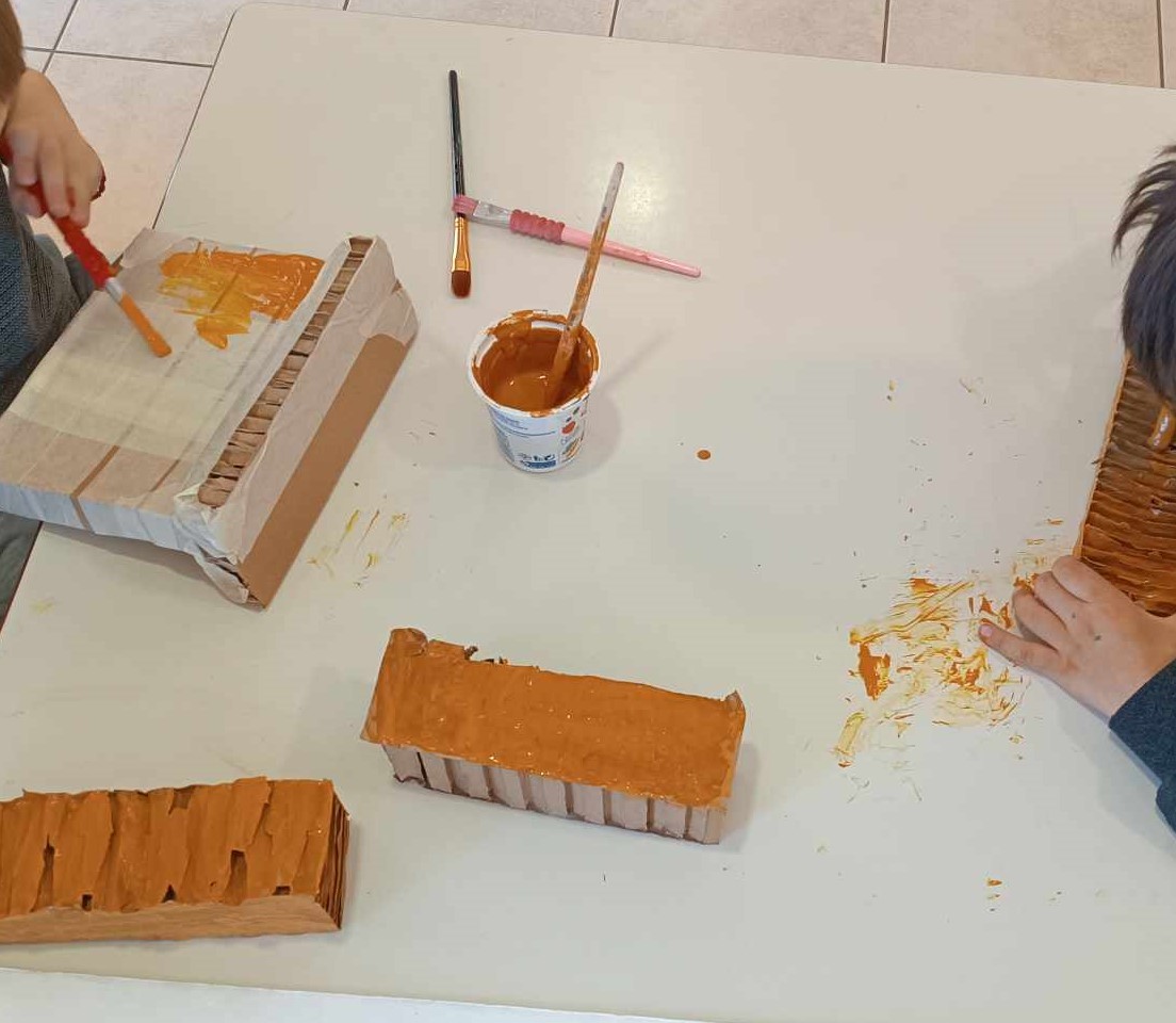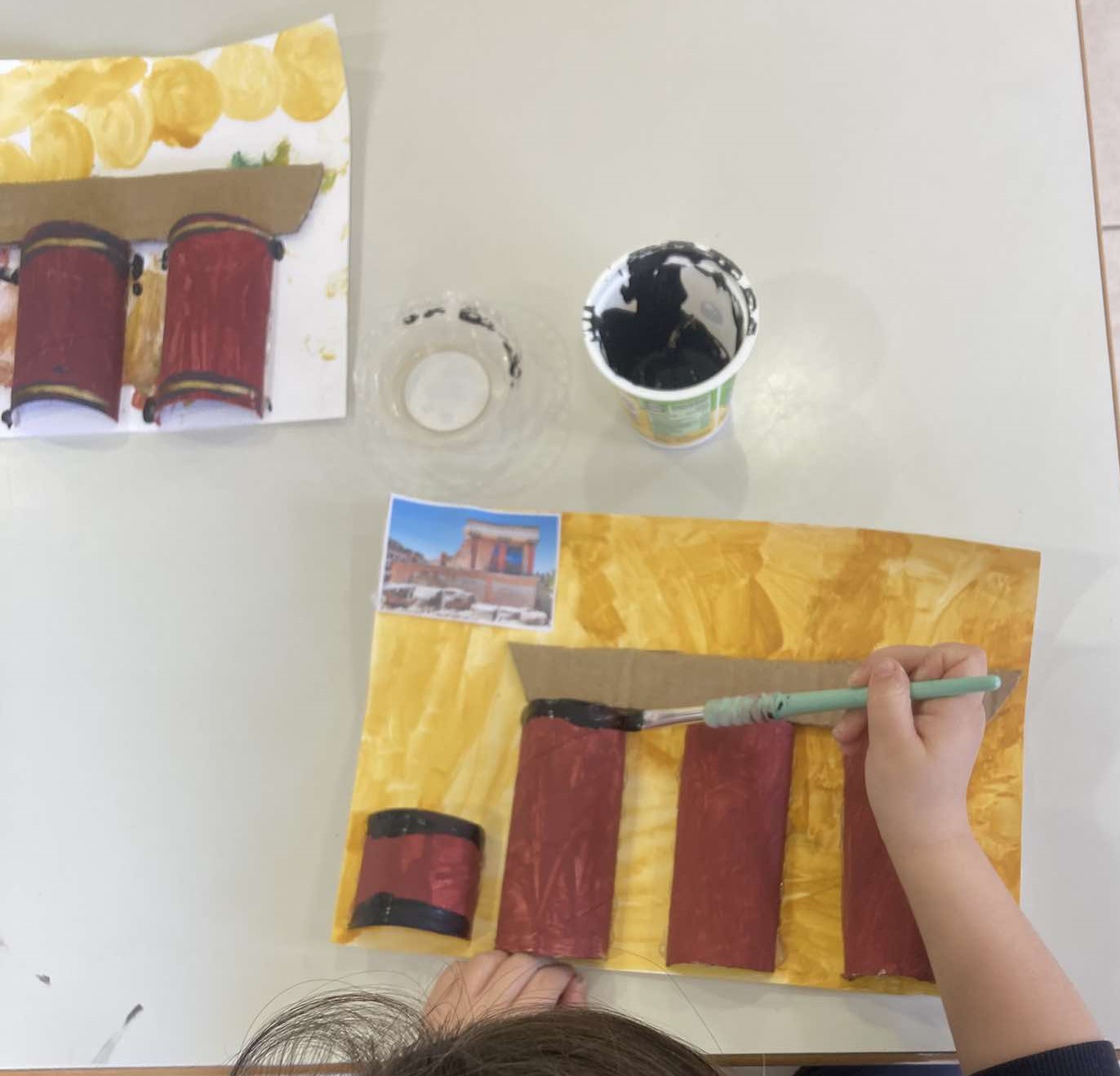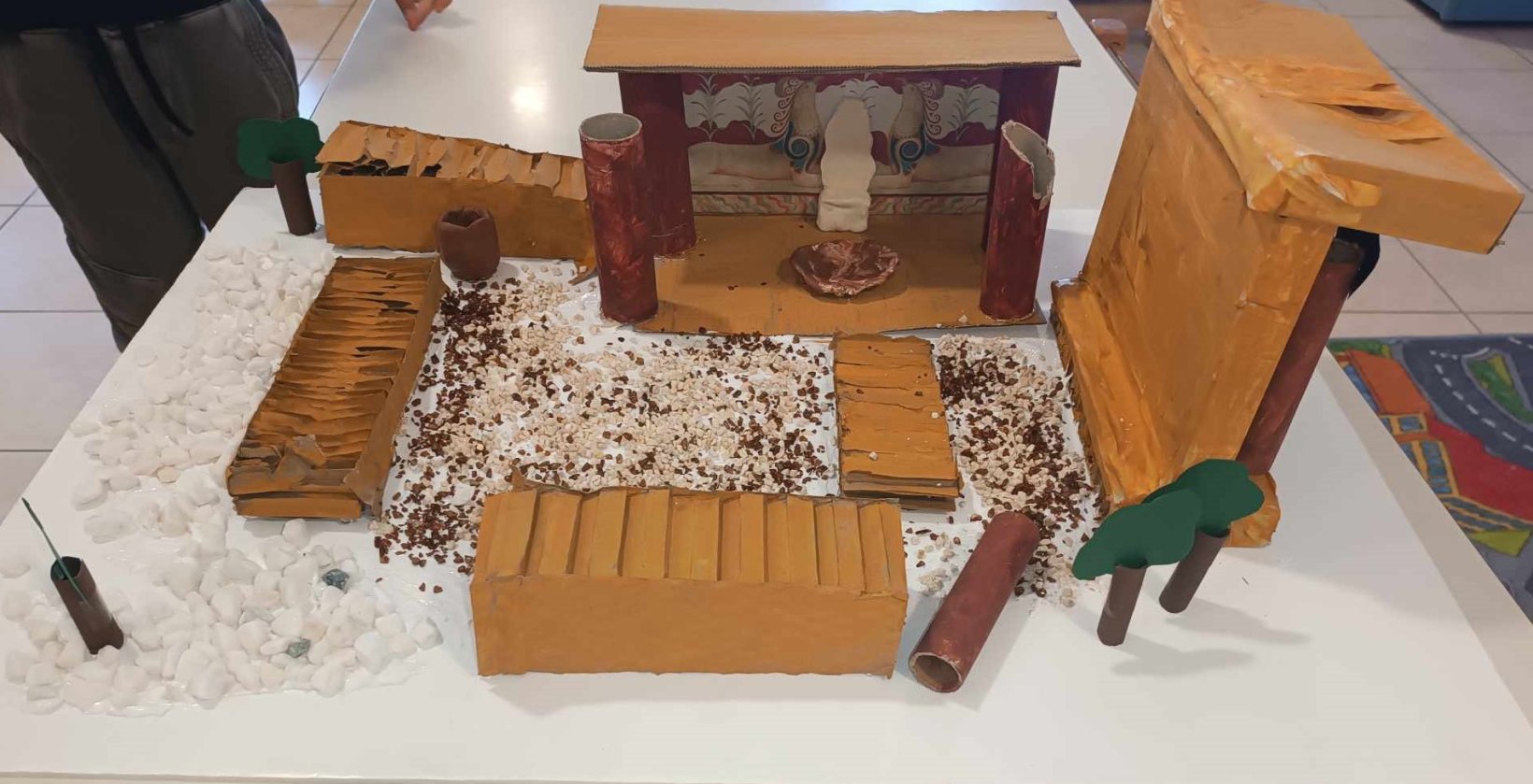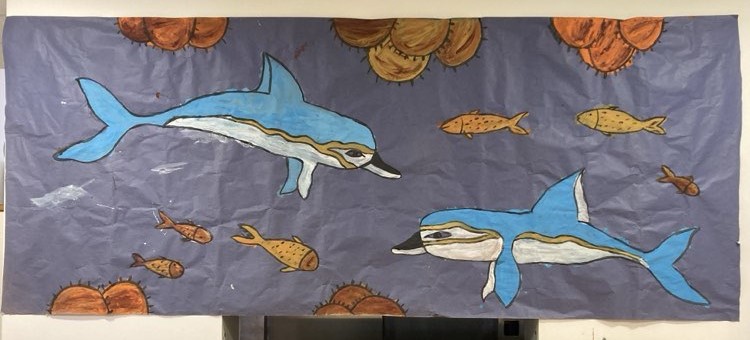 Στη συνέχεια, γίναμε καλλιτέχνες και αρχιτέκτονες: Δημιουργήσαμε μια γιγάντια τοιχογραφία με δελφίνια, που γέμισε με χρώμα το σχολείο μας.Ζωντανέψαμε την τοιχογραφία με τα ταυροκαθάψια, μπαίνοντας οι ίδιοι στον ρόλο των γενναίων αθλητών. Κατασκευάσαμε το παλάτι της Κνωσού με υλικά της επιλογής μας, δίνοντάς του τη δική μας πινελιά.