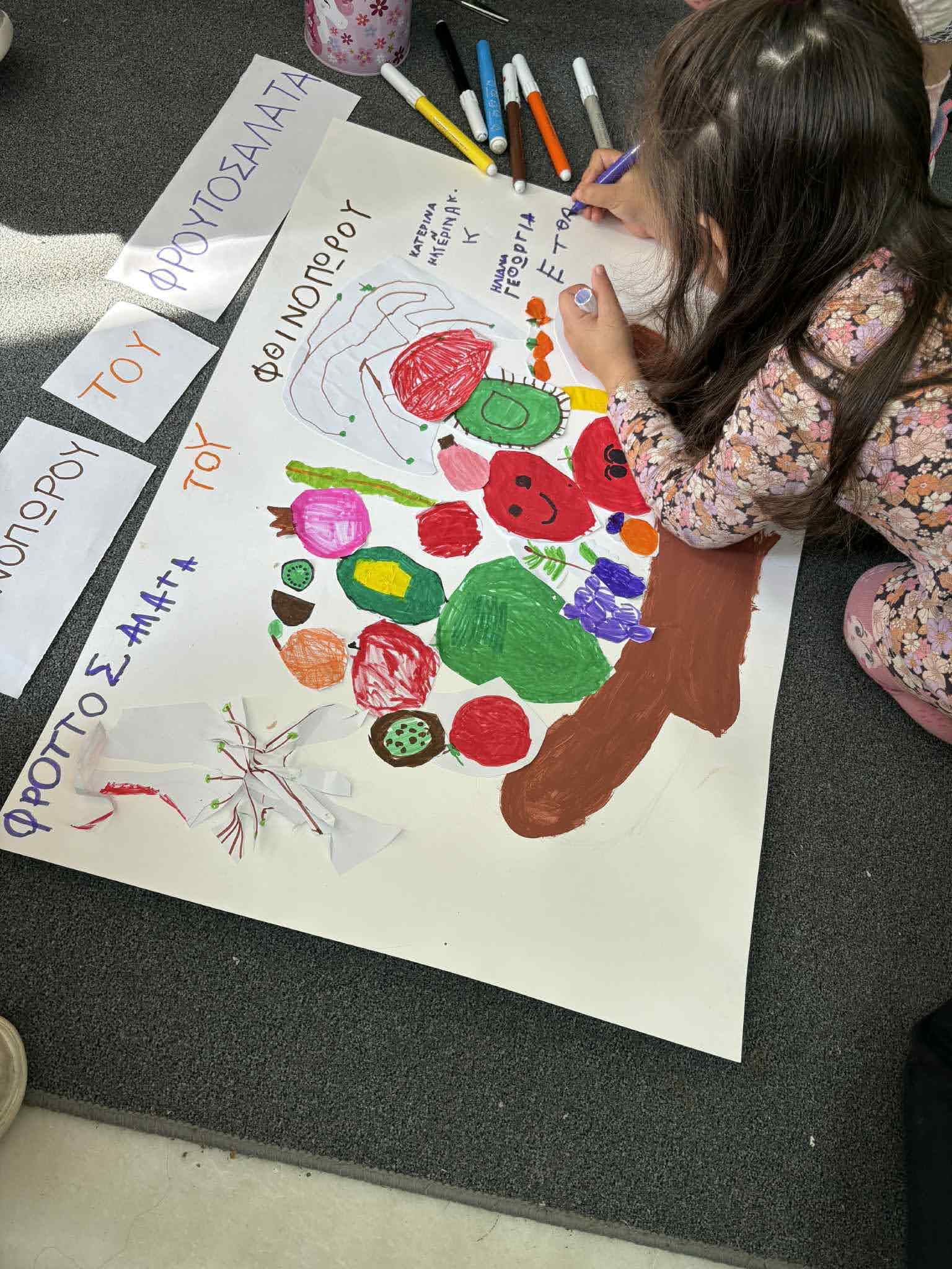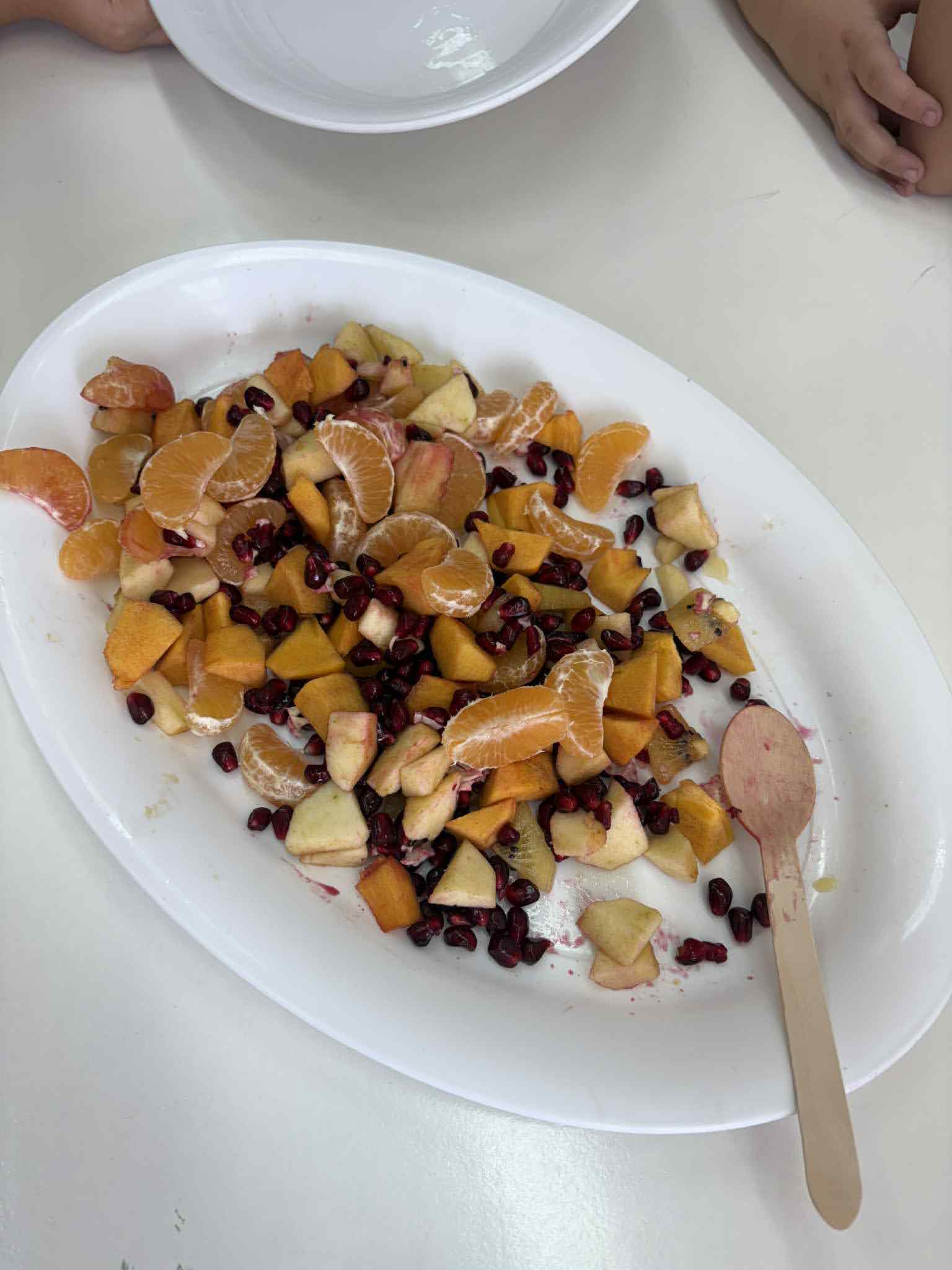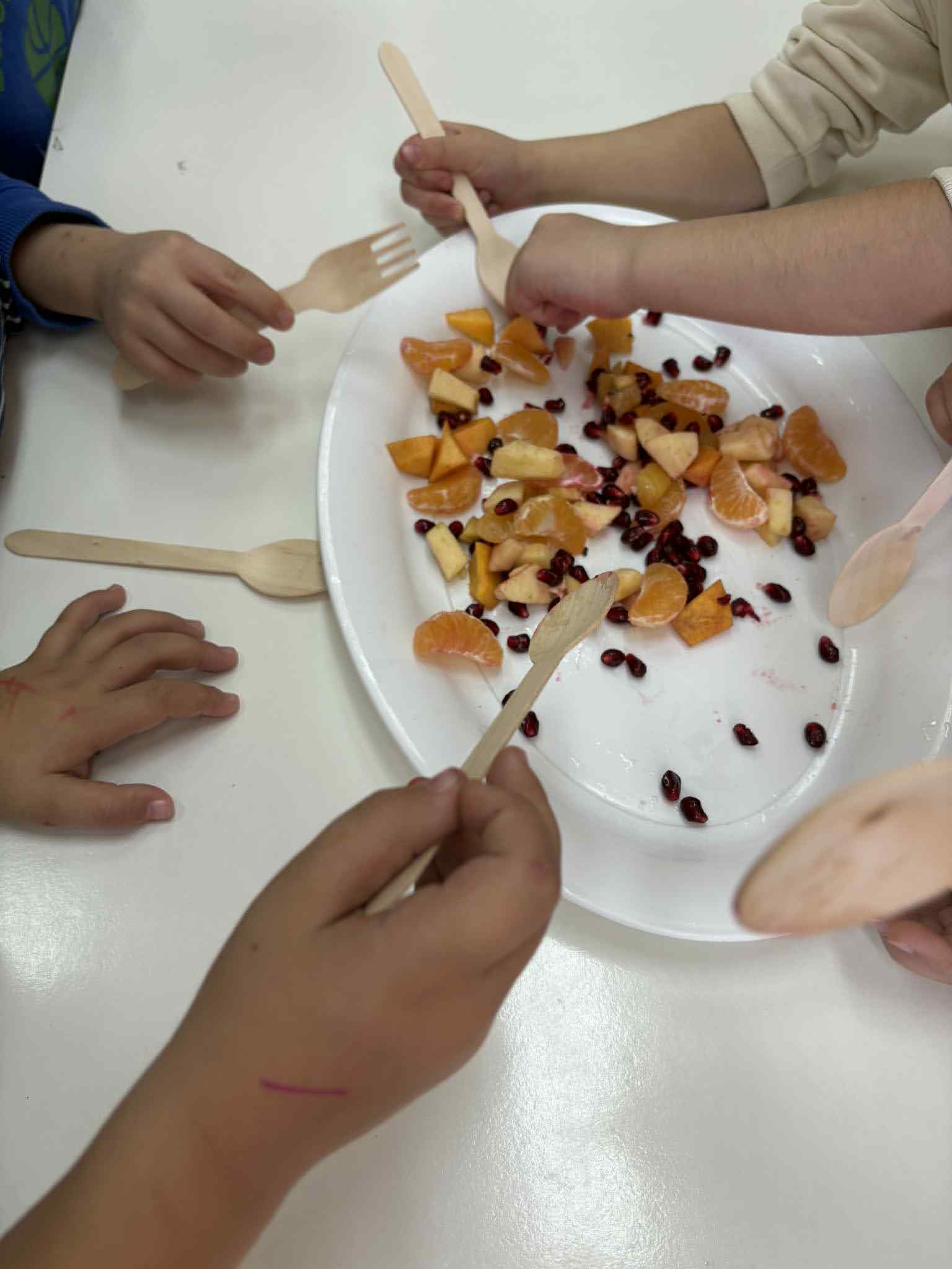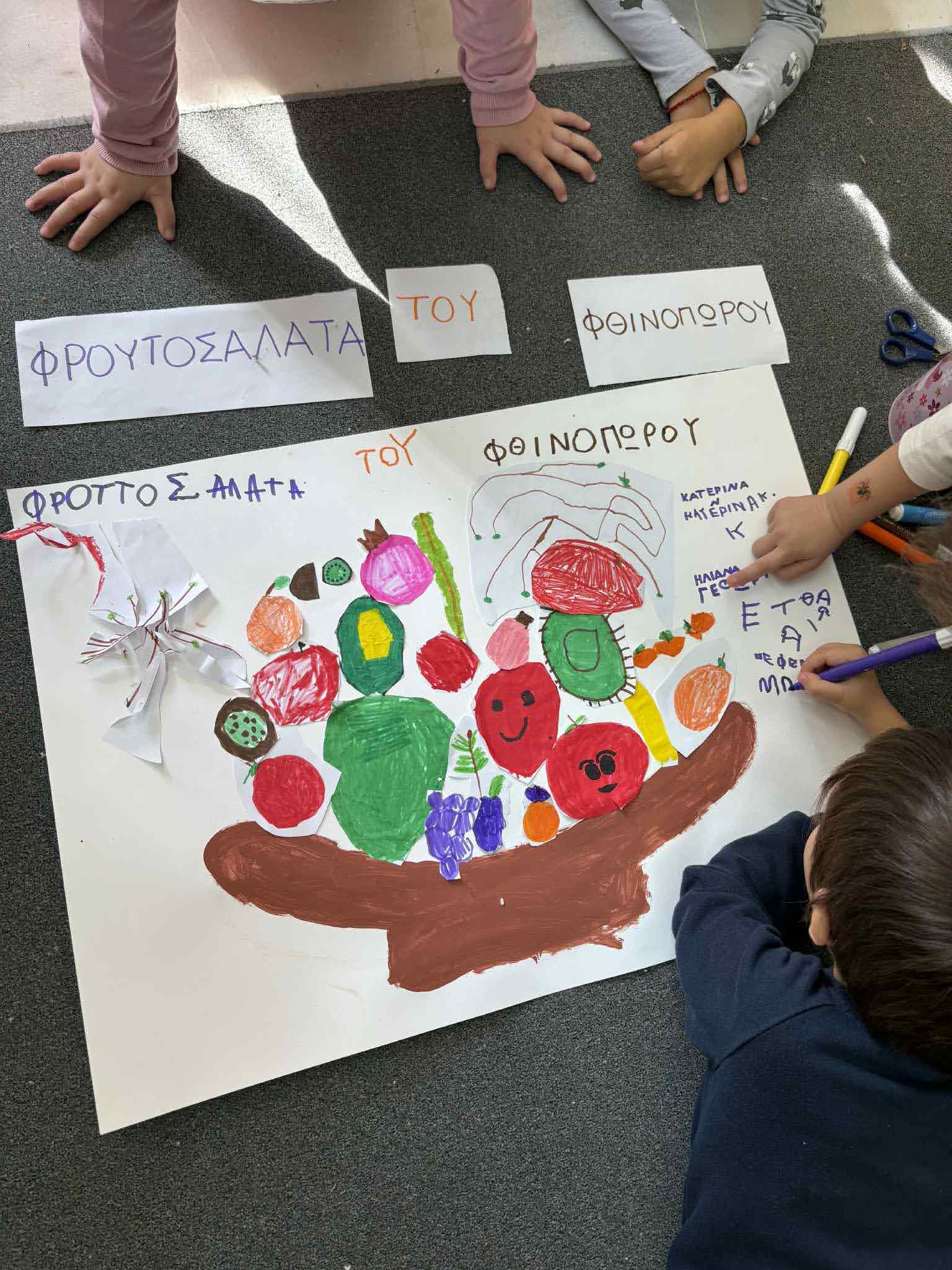 Ασχοληθήκαμε με τα φρούτα του φθινοπώρου. Μετρήσαμε τα φρούτα που έφεραν τα παιδιά στο σχολείο, παίξαμε παιχνίδια με τα φρούτα χρησιμοποιώντας τις αισθήσεις μας όπως γεύση, όσφρηση και αφή. Κόψαμε τα φρούτα για να φτιάξουμε φρουτοσαλάτα που ήταν πεντανόστιμη και εξοικειωθήκαμε με τις έννοιες ολόκληρο-μισό-τέταρτο.