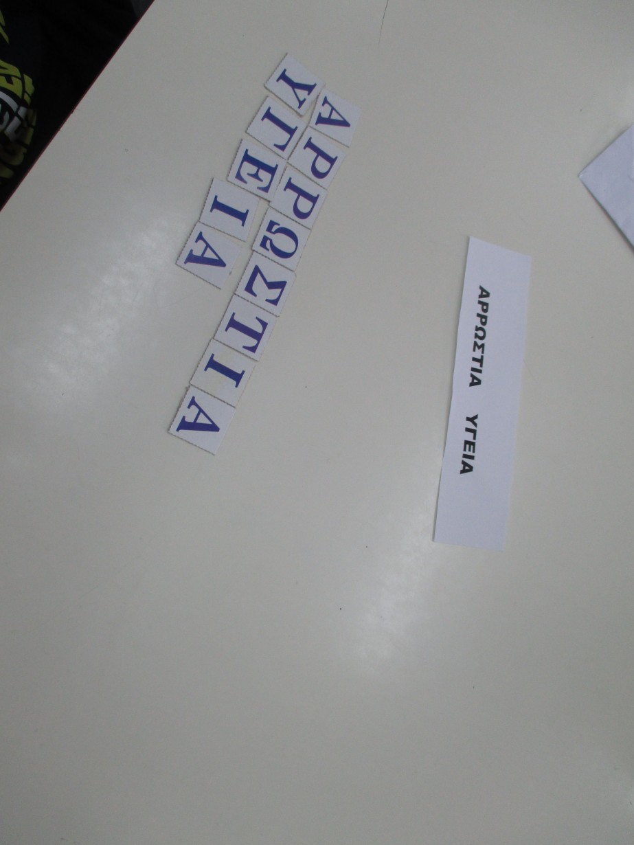 Στο τέλος, χωριστήκαμε σε ομάδες των 4 παιδιών. Όποια ομάδα έβαζε πρώτη στη σειρά τα γράμματα των λέξεων ΥΓΕΙΑ και ΑΡΡΩΣΤΙΑ κέρδιζε!