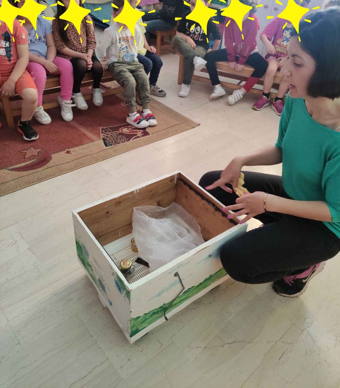 Δραματοποιήσαμε το μελισσοκόμο που πηγαίνει στην κυψέλη να μαζέψει το μέλι. Με το καπνιστήρι τις ζαλίζει και ανοίγει την κυψέλη για να συλλέξει το μέλι!!