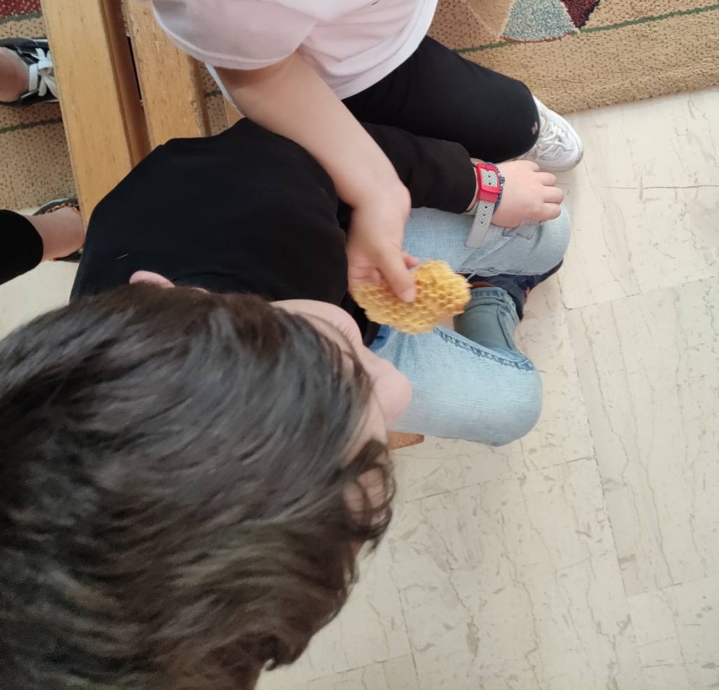 Μας επισκέφθηκε η γεωπόνος κ. Ζαχαριάδου Κική και μας μίλησε για τη δομή των λουλουδιών, τα αναπαραγωγικά του μέρη, για το σπουδαίο ρόλο της μέλισσας στον πολλαπλασιαμό των φυτών και των λουλουδιών, μας παρουσίασε τα στάδια παραγωγής μελιού και τα προϊόντα που παράγονται από τη μέλισσα.
