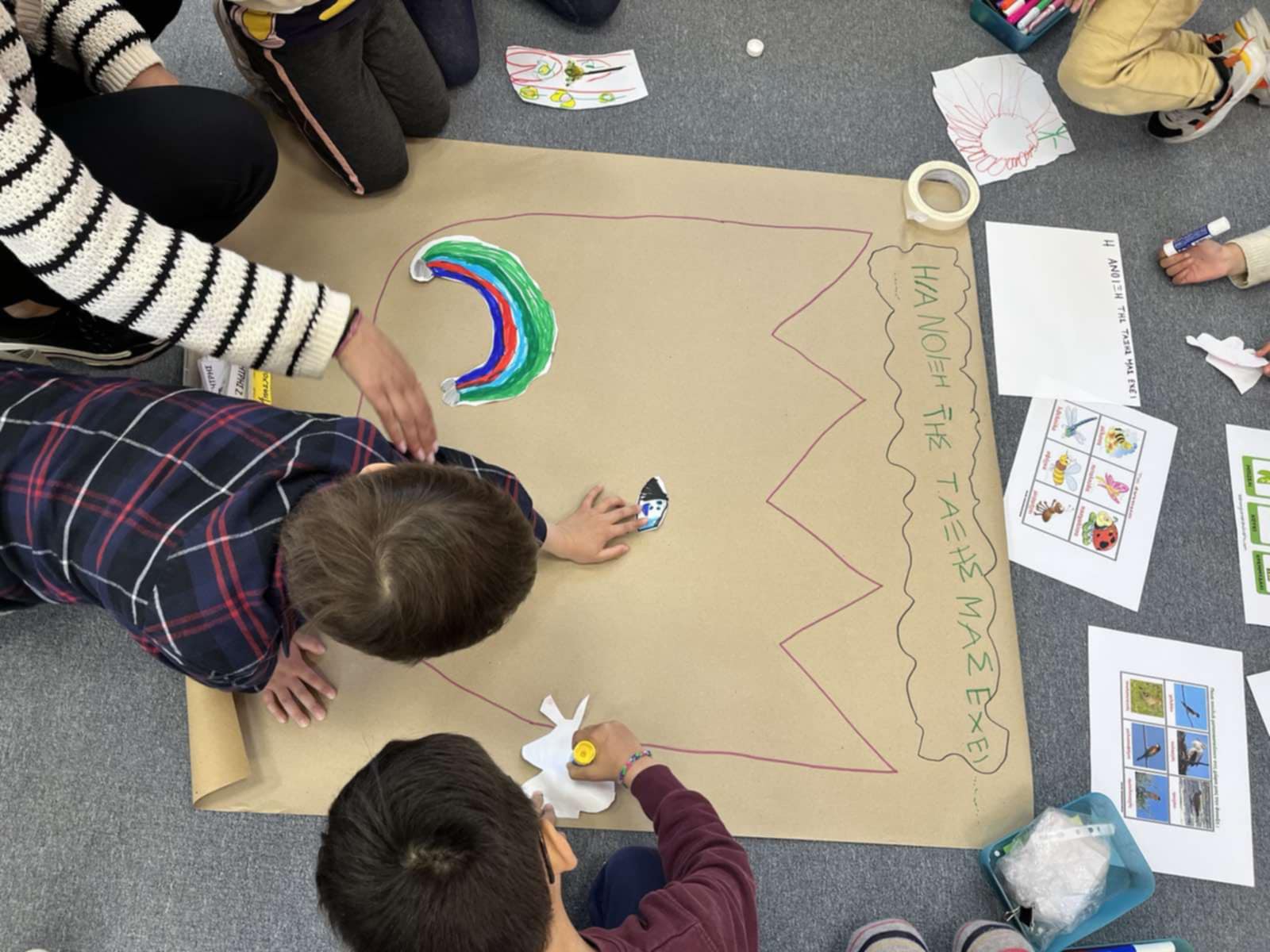 Τα παιδιά χωρίζονται σε ομάδες και εργαζόμενα είτε ατομικά είτε συνεργατικά, ζωγραφίζουν, δημιουργούν κολάζ ή γράφουν λέξεις για την Άνοιξη.