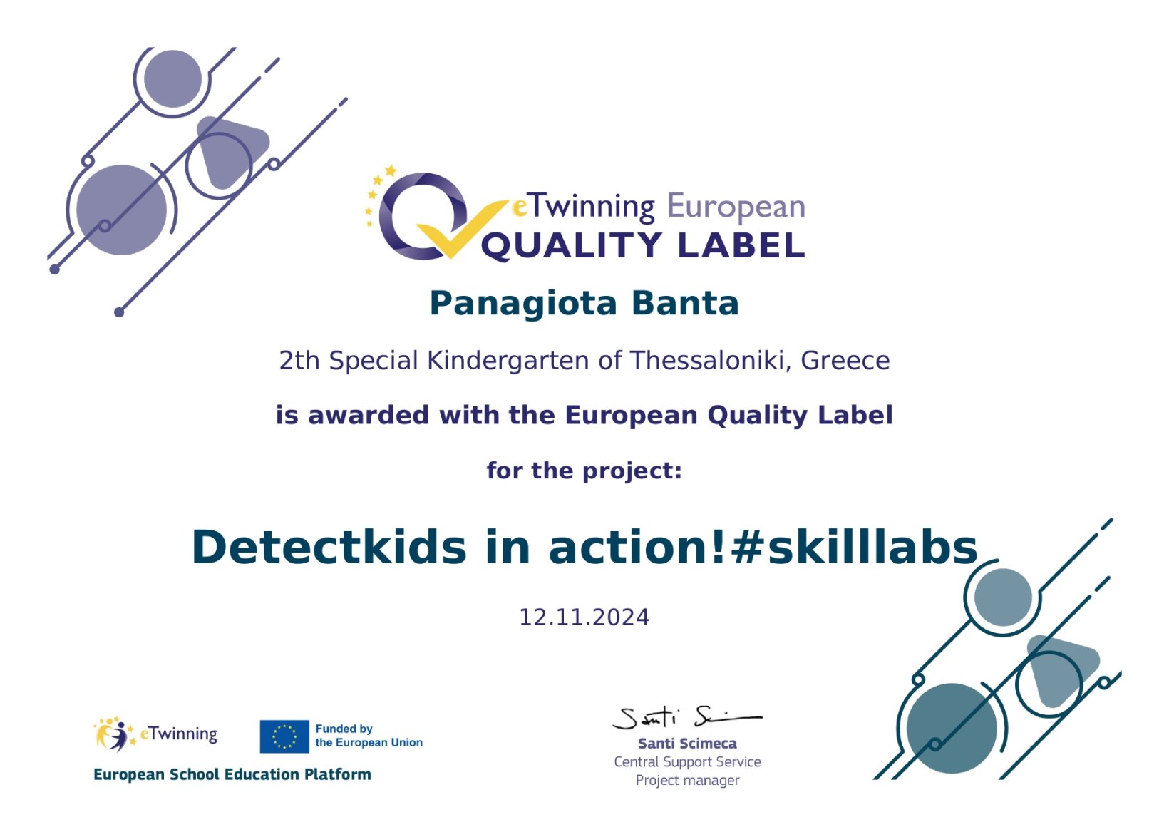 Ευρωπαϊκή Ετικέτα Ποιότητας στο e-Twinning έργο με τίτλο “Detectkids in action!#skillslabs”