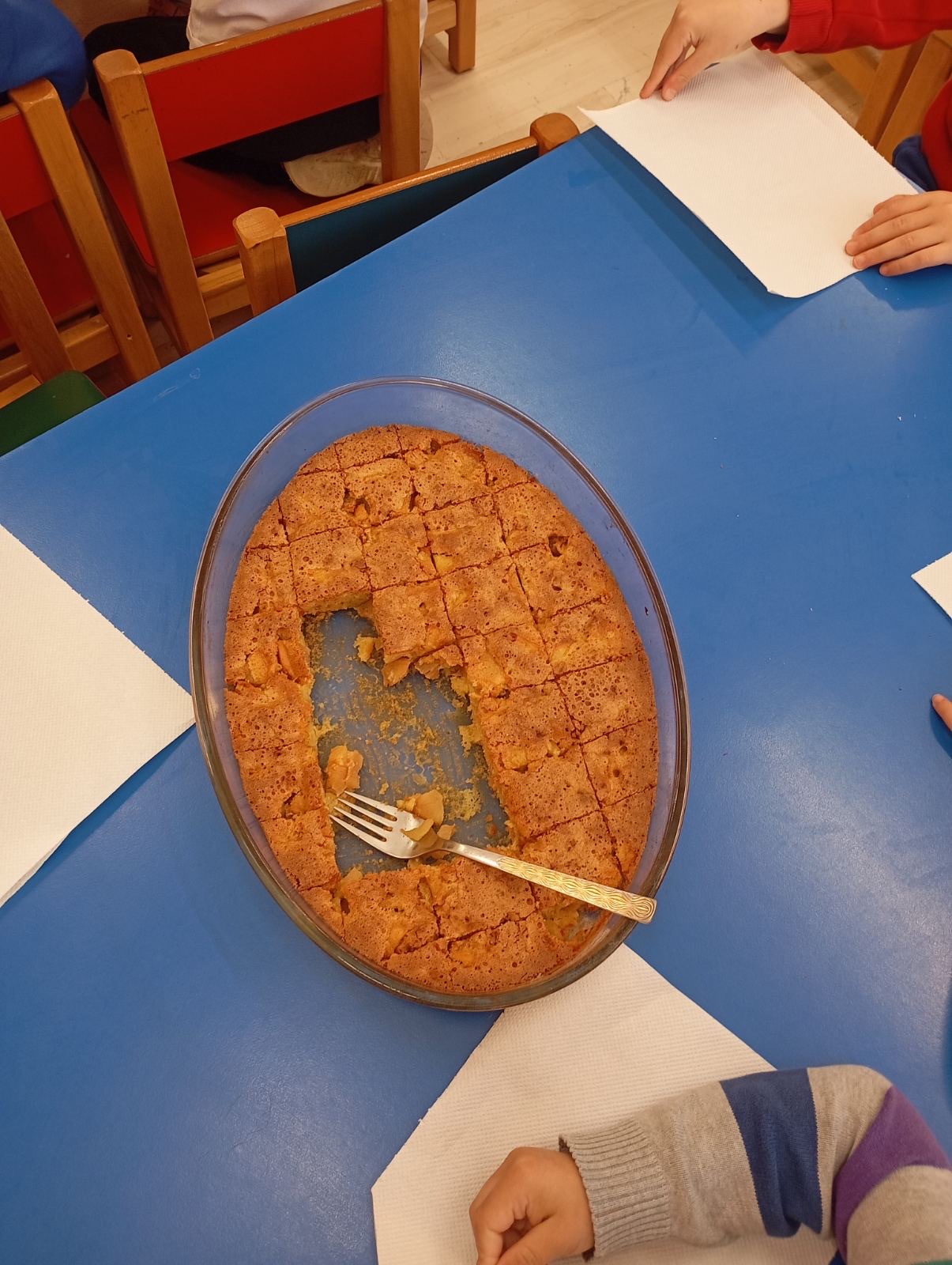 Τα παιδιά συμμετείχαν ενεργά σε όλη τη διαδικασία με χαρά, αναλαμβάνοντας καταρχήν να φέρουν το καθένα, από ένα υλικό της συνταγής στο σχολείο. Στη συνέχεια σημείωσαν την συνταγή, ταξινόμησαν και ζύγισαν τα υλικά, ανακάτεψαν τη ζύμη και την τοποθέτησαν στο ταψί.