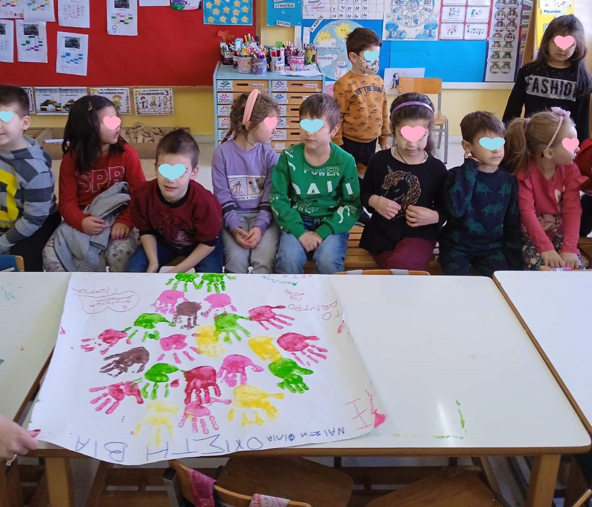 Ταυτόχρονα τα παιδιά εκφράστηκαν συνεργατικά και δημιουργικά φτιάχνοντας μία καταπληκτική αφίσα με όμορφα, διδακτικά και ελπιδοφόρα μηνύματα, που δείχνουν την ευαισθησία με την οποία προσέγγισαν το θέμα του εκφοβισμού. Με αυτό τον τρόπο και με σύνθημα το «ΜΙΛΑ ΤΩΡΑ», χρωματίσαμε τις παλάμες μας για να συνθέσουμε το δέντρο της φιλίας-αποδοχής και υποσχεθήκαμε με πολύχρωμη, χαρούμενη διάθεση να είμαστε όλοι φίλοι και να σεβόμαστε ο ένας τις ιδιαιτερότητες του άλλου.