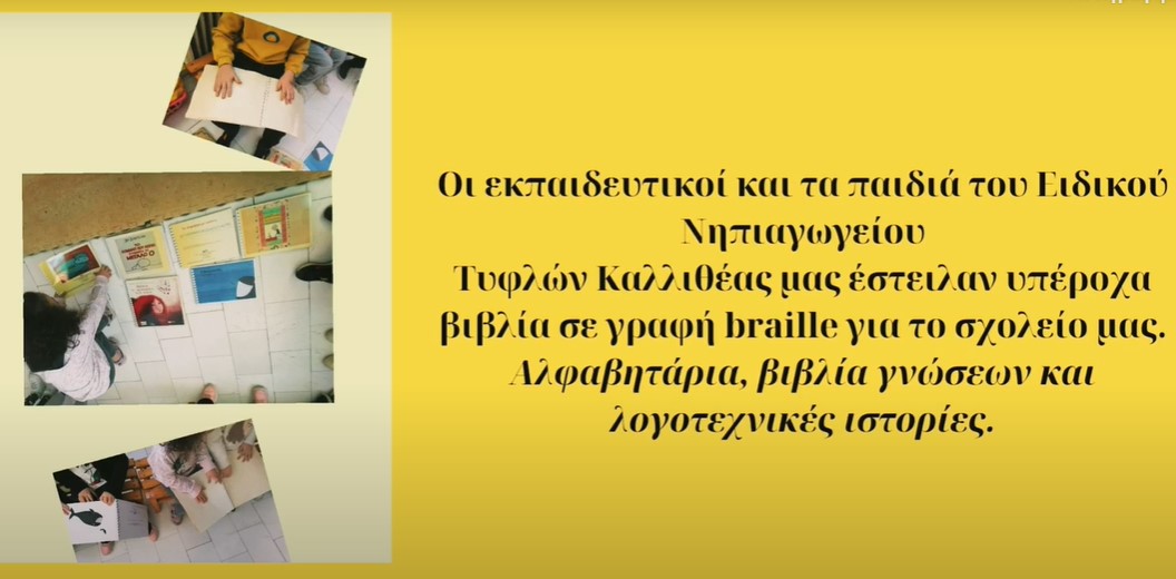 Την Τρίτη 2 Απριλίου 2024, παγκόσμια ημέρα παιδικού βιβλίου, πραγματοποιήθηκε διαδικτυακή συνάντηση με το ειδικό νηπιαγωγείο Τυφλών Καλλιθέας και είχαμε την ευκαιρία να παρακολουθήσουμε την ανάγνωση ενός όμορφου παραμυθιού από τυφλό παιδάκι του ειδικού νηπιαγωγείου από βιβλίο γραμμένο με το σύστημα braille. Τα παιδιά άκουσαν με μεγάλο ενδιαφέρον το παραμύθι και θαύμασαν την ικανότητα ανάγνωσης ενός βιβλίου με την γραφή braille. Ακολούθησε μια πολύ ευχάριστη διαδικτυακή συζήτηση μεταξύ μαθητών και εκπαιδευτικών των δύο σχολείων.