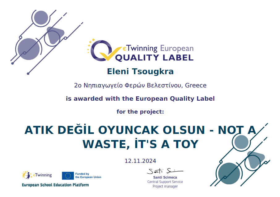 Aπονεμήθηκε Ευρωπαϊκή Ετικέτα Ποιότητας: “European Quality Label” για το eTwinning Project «Not a waste, Ιt’s a Toy!», από την ομάδα της Ευρωπαϊκής Πλατφόρμας Σχολικής Εκπαίδευσης: «European School Education Platform- ESEP», σε συνέχεια της απονομής της Εθνικής Ετικέτας Ποιότητας.