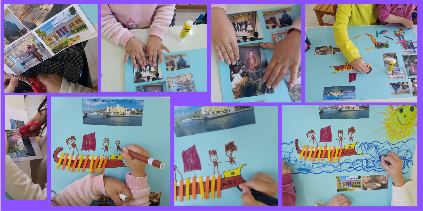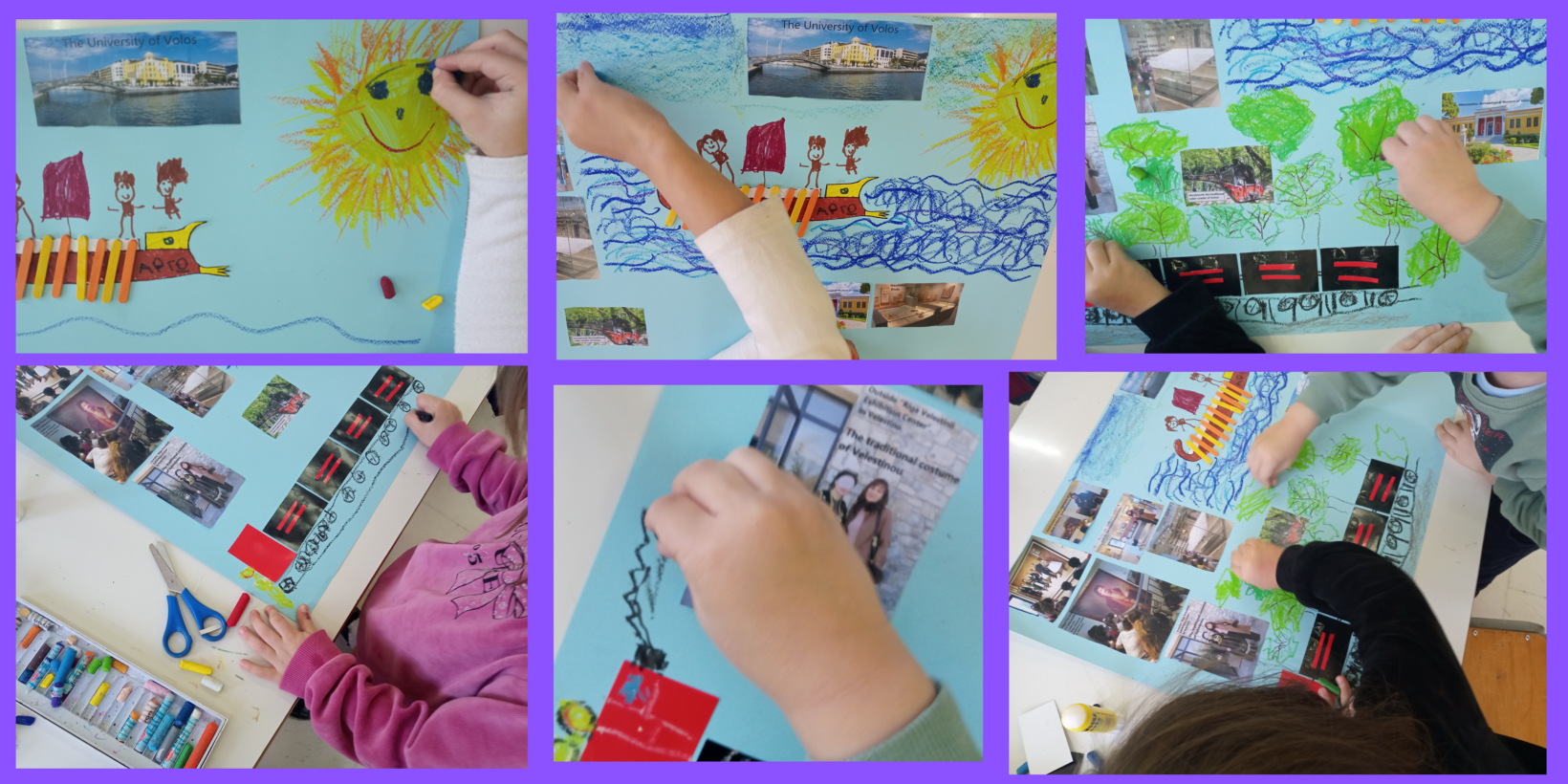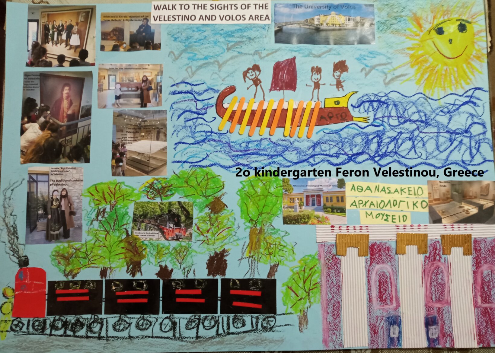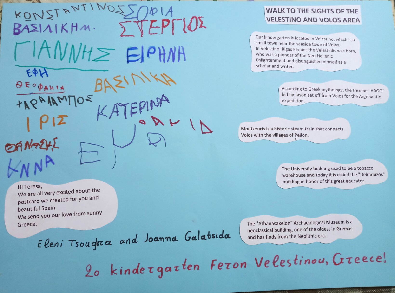 Ο τίτλος που δώσαμε στο πρώτο μας καρτ-ποστάλ είναι: “Sightseeing tour of the Velestino and Volos area”!!, δηλαδή «Περιήγηση στα αξιοθέατα της περιοχής του Βελεστίνου και του Βόλου”, αναφέροντας στο περιβάλλον του eTwinning Project της European School Education Platform: “We created the postcard collaboratively, using different materials and our imagination to render, as best as possible, the attractions that exist in Velestino and Volos. We sought through art to transport you to the beauties of our region”.