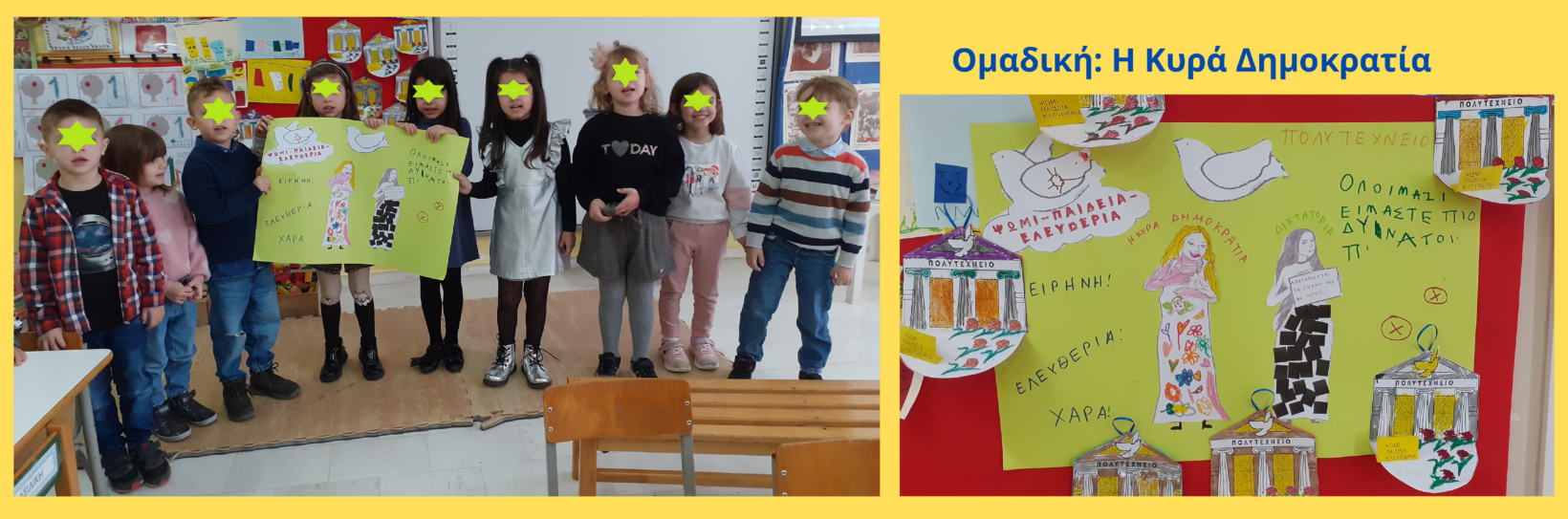 Συζητήσαμε και διαπιστώσαμε πως όταν υπάρχουν όμορφα χρώματα γύρω μας και καλοσυνάτοι άνθρωποι νιώθουμε χαρούμενοι. Έτσι δόθηκε η ευκαιρία να εκφράσουν τα παιδιά τις απόψεις τους σχετικά με το πότε είναι χαρούμενα. Επιπλέον, αποτύπωσαν τις σκέψεις τους με ζωγραφική και όμορφα χρώματα. Έτσι, αποφασίσαμε να φτιάξουμε ένα ουράνιο τόξο και να το στολίσουμε με τις ζωγραφιές των παιδιών: Λέμε ΝΑΙ στα ΦΩΤΕΙΝΑ ΧΡΩΜΑΤΑ, ΝΑΙ ΣΤΗΝ ΨΥΧΙΚΗ ΥΓΕΙΑ!